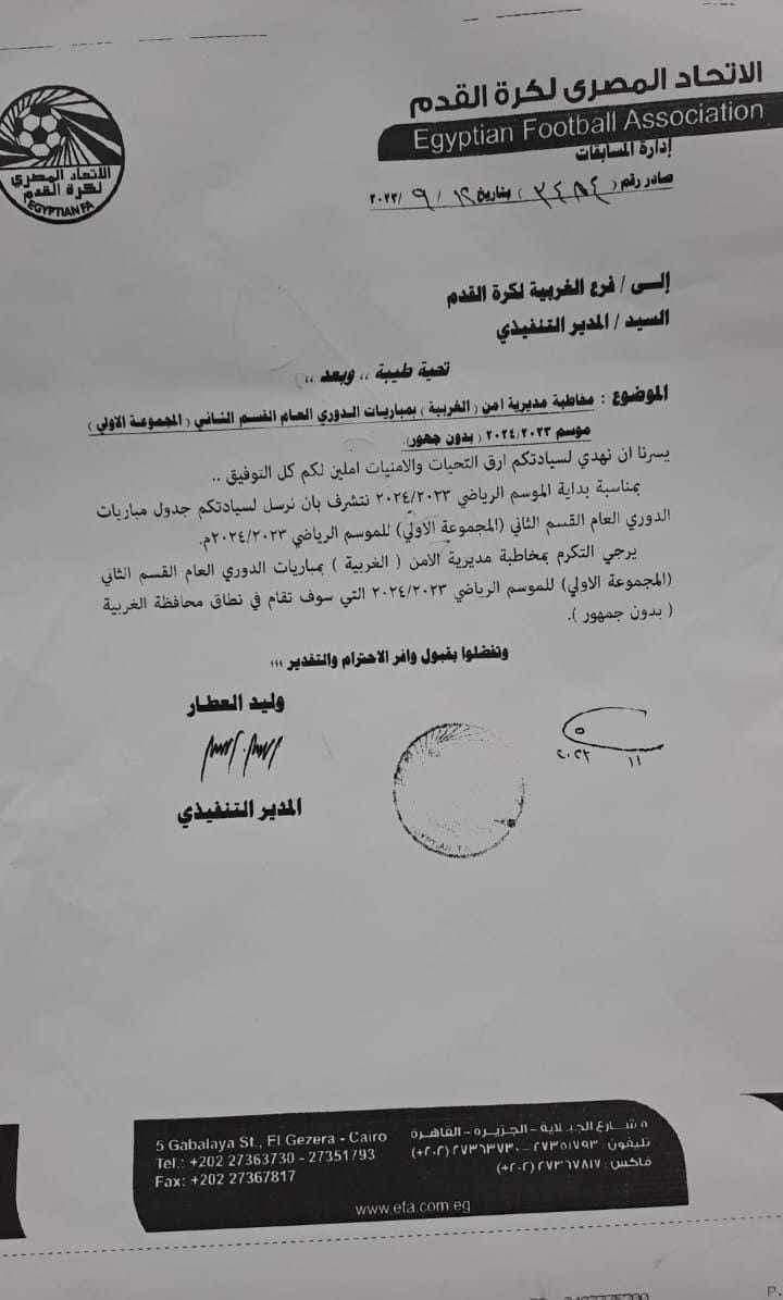 أرسل الاتحاد المصري لكرة القدم خطابا رسميا إلي فرع الغربية ، يفيد بأن مباريات دوري المحترفين دون جمهور، كما طالبهم بمخاطبة الأمن وإبلاغه بمواعيد المباريات، وإرفاق نسخة من جدول الدوري إلى الأمن.