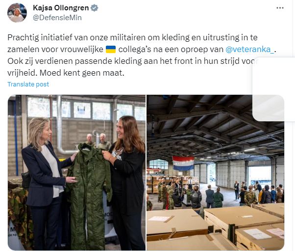 فوزارة الدفاع الهولندية، قالت أمس الخميس، إن جنديات هولنديات تبرعن بأعداد كبيرة من الأحذية والقبعات وأشياء عسكرية أخرى للنساء اللاتي تقاتلن في الجيش الأوكراني ضد العملية العسكرية الروسية.