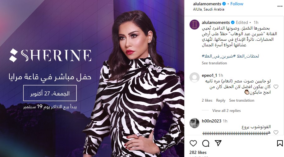من ناحية آخري، كانت أعلنت مدينة العلا بالمملكة العربية السعودية، عبر حسابها الشخصي على موقع تبادل الصور والفيديوهات إنستجرام، حفل المطربة شيرين عبد الوهاب، والمقرر إقامته يوم 27 أكتوبر المقبل على خشبة مسرح قاعة ماريا بالمدينة.