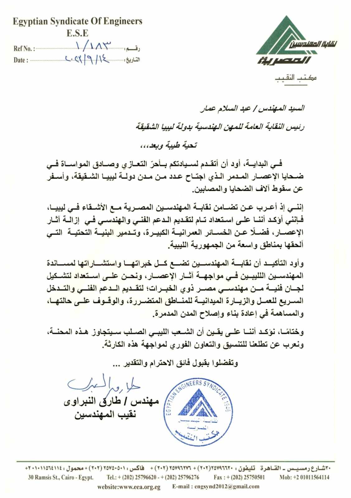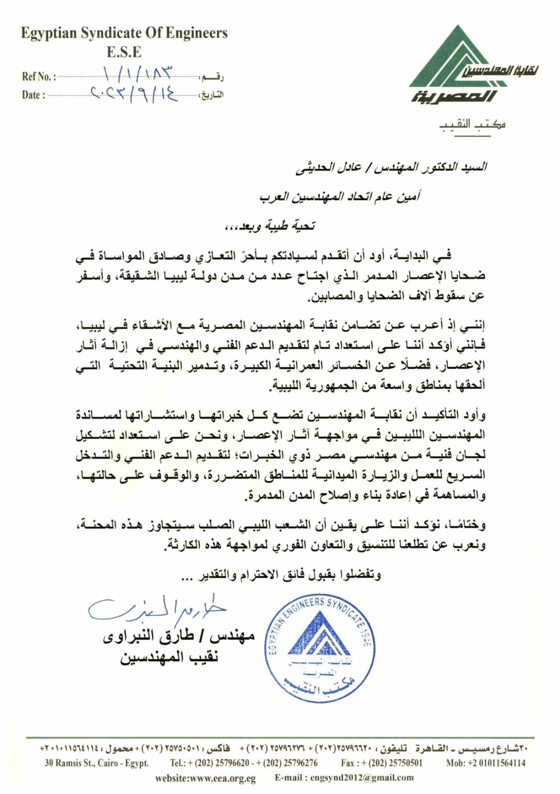 وأضاف نقيب المهندسين:" أود التأكيد أن نقابة المهندسين تضع كل خبراتها واستشاراتها لمساندة المهندسين الليبيين في مواجهة آثار الإعصار، ونحن على استعداد لتشكيل لجان فنية من مهندسي مصر ذوي الخبرات؛ لتقديم الدعم الفني والهندسي والتدخل السريع للعمل والزيارة الميدانية للمناطق المتضررة، والوقوف على حالتها، والمساهمة في إعادة بناء وإصلاح المدن المنكوبة.