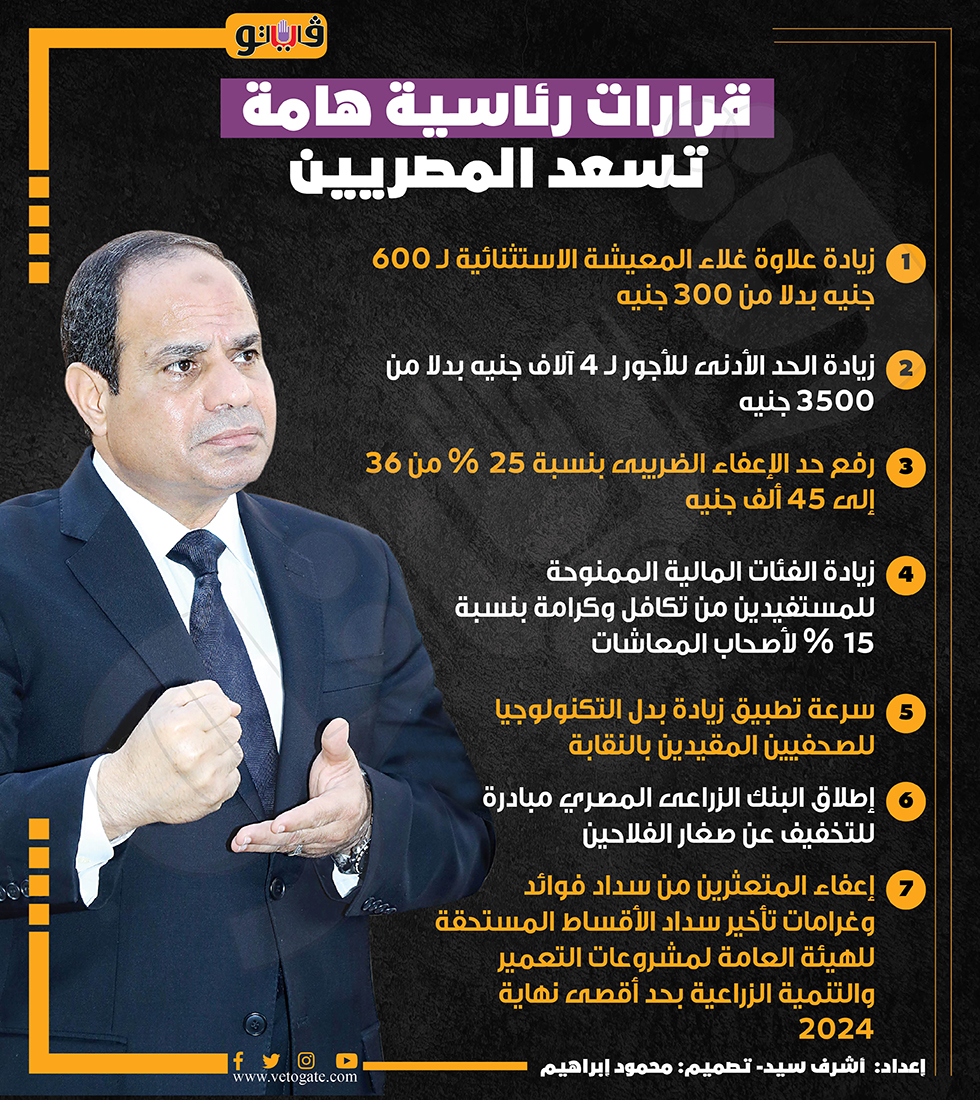 قرارات رئاسية هامة تسعد المصريين (انفوجراف) السبت 16/سبتمبر/2023 - 03:57 م 9/16/2023 3:57:59 PM الرئيس السيسي، فيتو أشرف سيد شارك طباعة 18 حجم الخط شارك طباعة الرئيس السيسي اصحاب المعاشات بدل التكنولوجيا للصحفيين هيئة العامة لمشروعات التعمير والتنمية الزراعية زيادة بدل التكنولوجيا للصحفيين رفع حد الإعفاء الضريبي المنحة الاستثنائية لاصحاب المعاشات