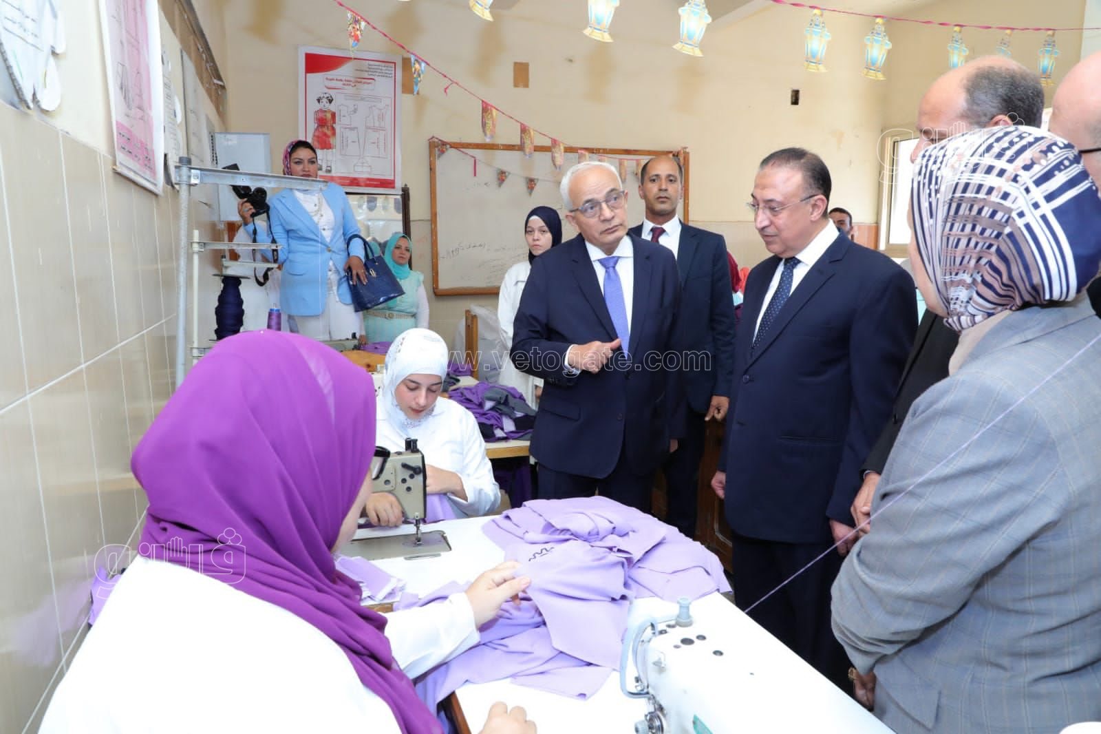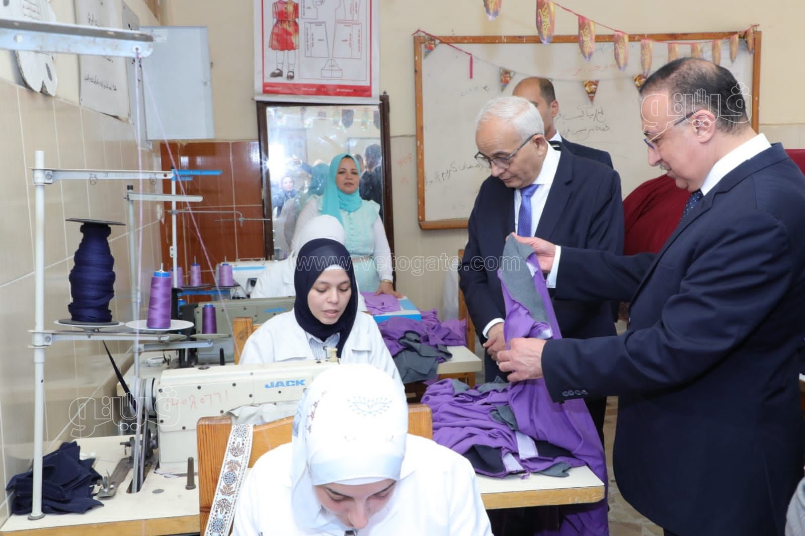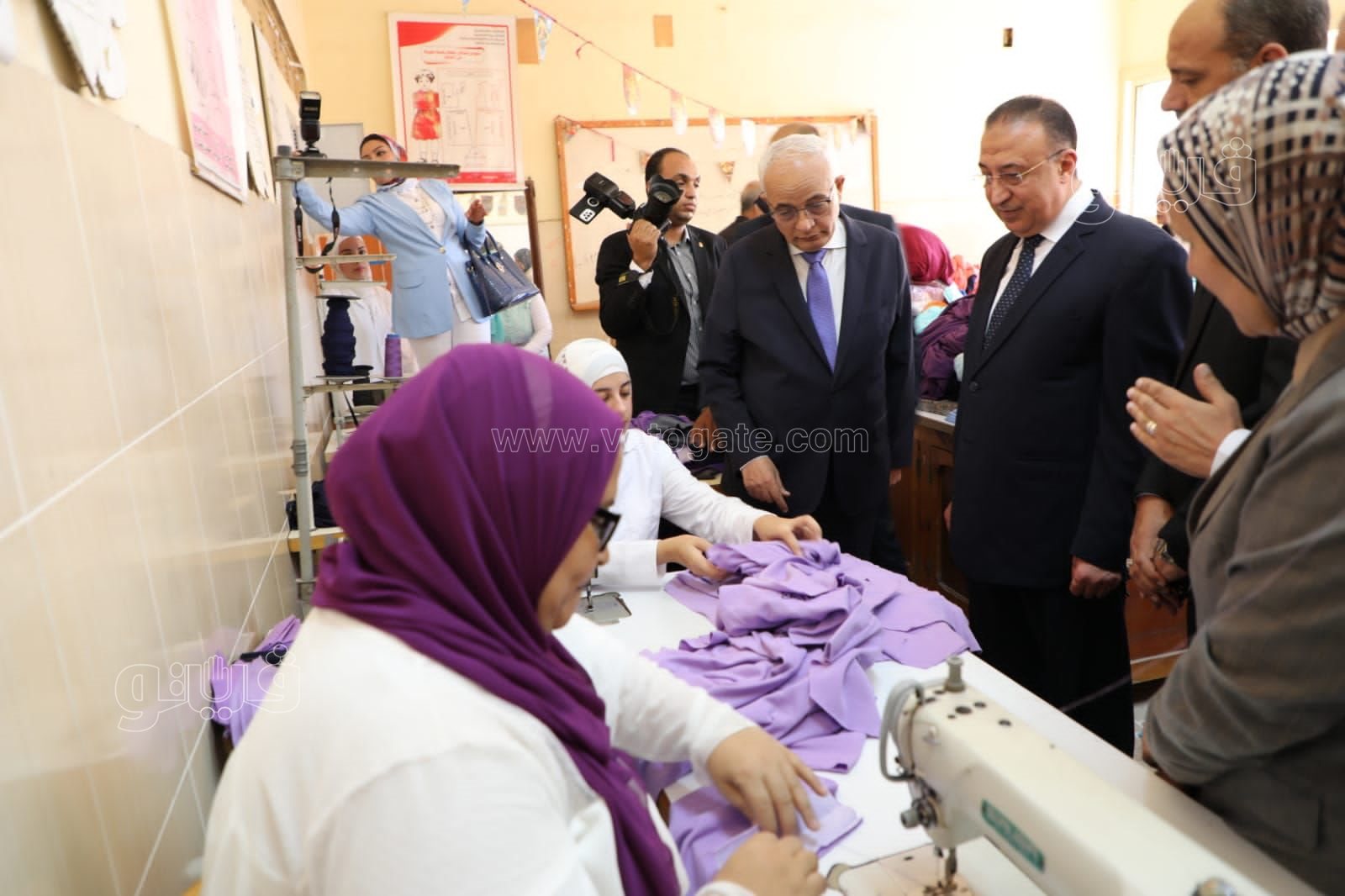 وتفقد الوزير والمحافظ ورش العمل لقسم الملابس الجاهزة داخل المدرسة، واستعرضوا تفاصيل إنتاج الطالبات للزي المدرسى للمحافظة.