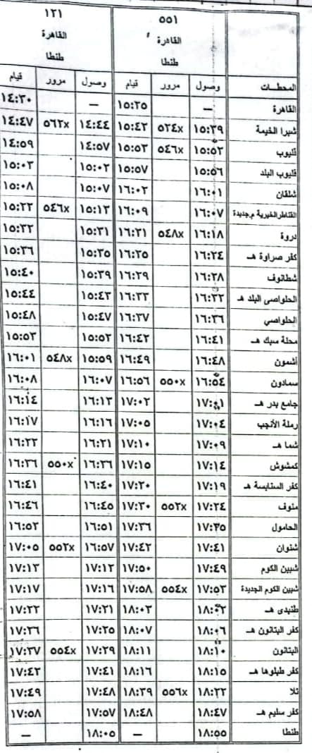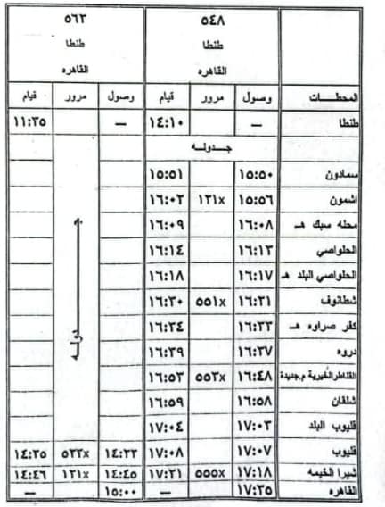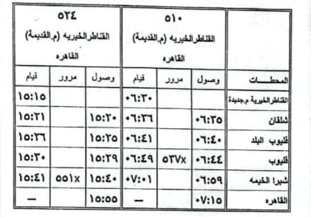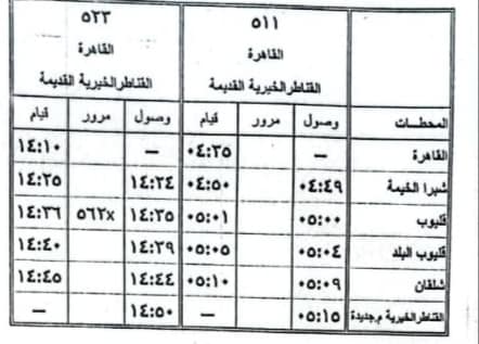 أعلنت الهيئة القومية للسكك الحديد تعديل بعض مواعيد وحركة بعض القطارات بداية من اليوم وذلك لخدمة الركاب على كافة الخطوط بإعادة تشغيل قطاري 523 / 524 ركاب (القاهرة / القناطر الخيرية والعكس ) ويترتب على ذلك تعديل قطارات ( 548 / 562 / 551 / 121 ) طبقا للجداول المرفقة.