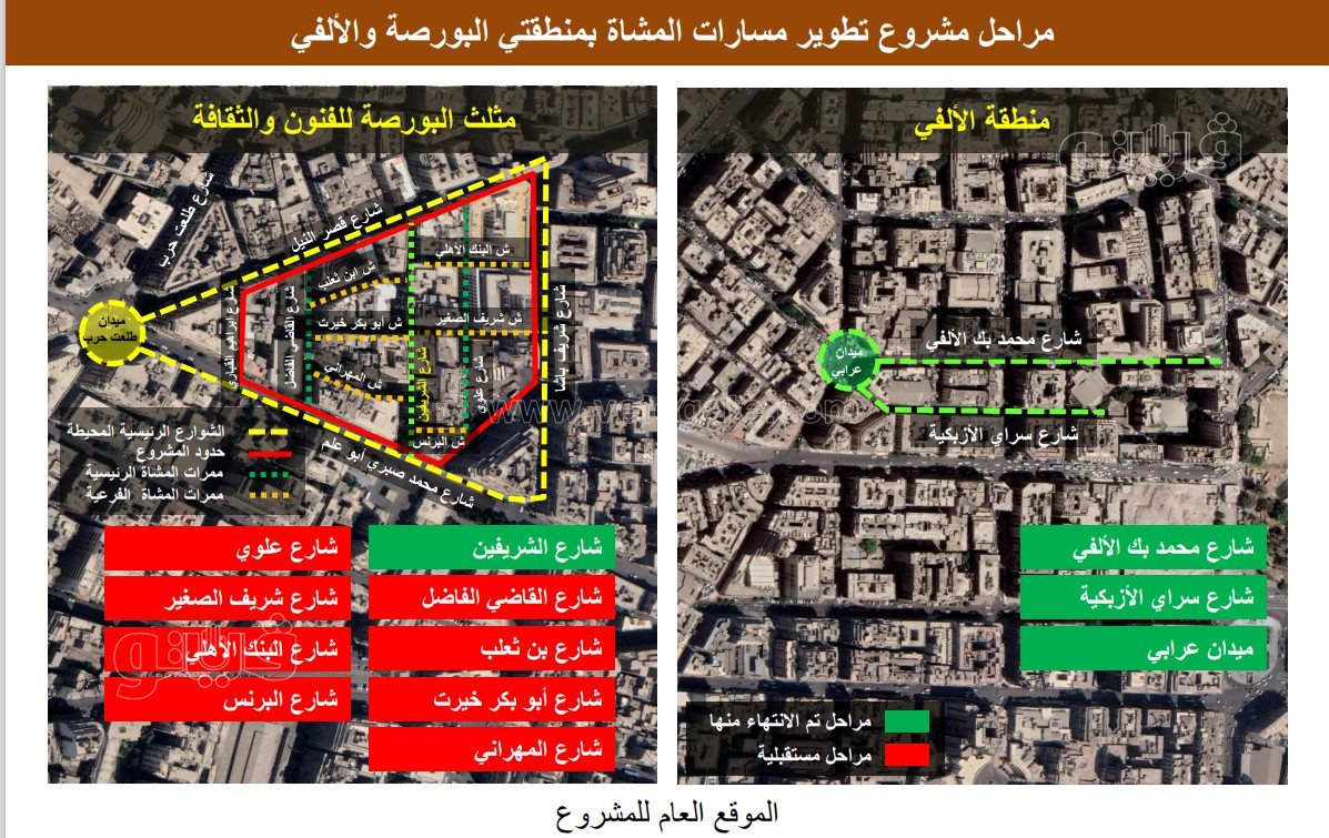 ويضم مشروع تطوير القاهرة الخديوية تطوير 12 شارعًا للمشاة بمنطقتي البورصة والألفي، ففىيمنطقة الألفي تم تطوير شارع محمد بك الألفي، وشارع سراي الأزبكية وميدان عرابي، أما في منطقة مثل البورصة للثقافة والفنون تم تطوير شارع الشريفين، وجارى تطوير شوارع كل من القاضي الفاضل، بن ثعلب،أبوبكر خيرت، المهراني، علوي،شريف الصغير، البنك الأهلي، البرنس.