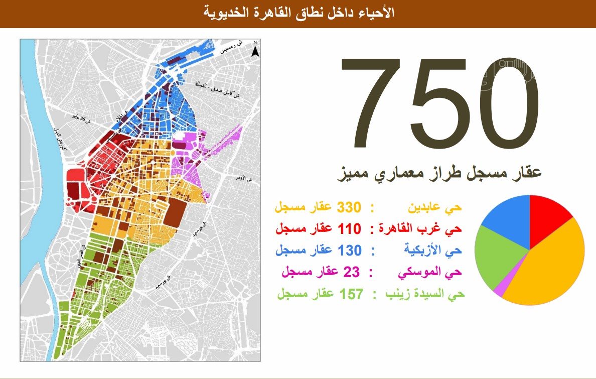 تحتوى الأحياء داخل نطاق القاهرة الخديوية على 750 عقار مسجل طراز معماري مميز، فيقع في حي عابدين 330 عقارًا مسجلًا، وفي حي غرب القاهرة 110 عقارات مسجلة، حى الأزبكية 130 عقارًا مسجلًا، حى الموسكى 23 عقارًا مسجلًا، حي السيدة زينب 157 عقارًا مسجلًا.