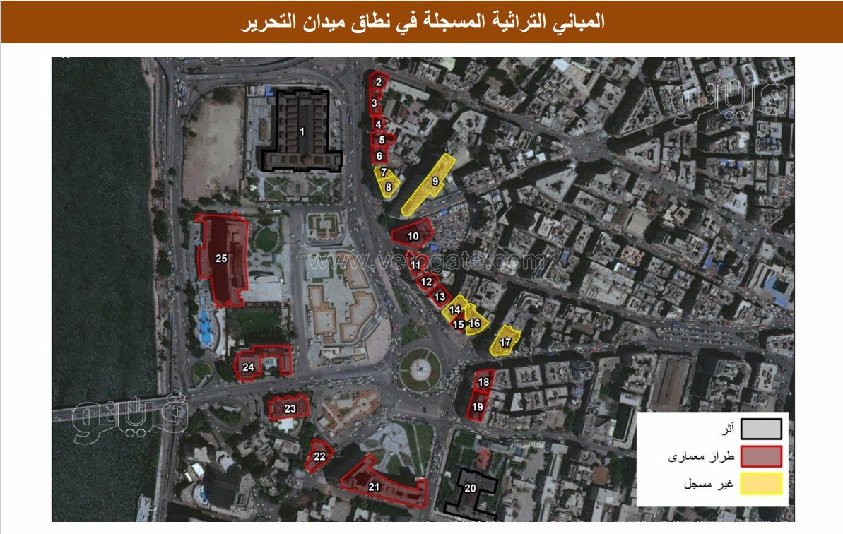 تزخر منطقة ميدان التحرير بالأبنية التراثية المسجلة، حيث تضم 25 مبنى وهم: