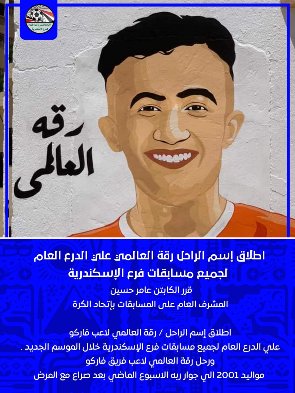 وأكدت منطقة الإسكندرية أن الكابتن عامر حسين المشرف العام على المسابقات بإتحاد الكرة قرر إطلاق اسم الراحل رقة العالمي لاعب فاركو على الدرع العام لجميع مسابقات فرع الإسكندرية خلال الموسم الجديد.