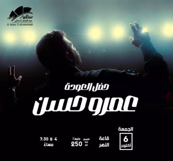 يحيي الشاعر عمرو حسن حفلين شعريين وذلك في ساقية الصاوي بالزمالك، يوم الجمعة 6 أكتوبر المقبل، حيث يقام الحفل الأول في تمام الرابعة عصرًا، ويأتي الحفل الثاني في تمام 7.30 مساء، على مسرح قاعة النهر بالساقية.