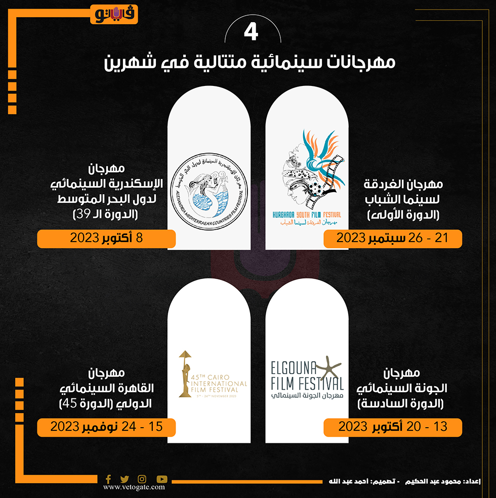 4 مهرجانات سينمائية متتالية في شهرين (إنفوجراف) الإثنين 18/سبتمبر/2023 - 07:04 م 9/18/2023 7:04:22 PM مهرجانات سينمائية متتالية في شهرين، فيتو محمود عبد الحكيم شارك طباعة 18 حجم الخط شارك طباعة مهرجان الجونة السينمائي الدولي الدورة 45 من مهرجان القاهرة السينمائي مهرجان الغردقة لسينما الشباب مهرجان الاسكندرية السينمائي لدول البحر المتوسط اخبار الفن