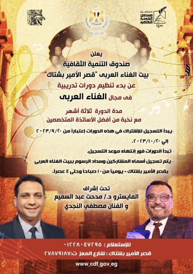 ينظم بيت الغناء العربى بقصر الأمير بشتاك، التابع لقطاع صندوق التنمية الثقافية، دورات تدريبية فى مجال الغناء العربي لمدة ثلاثة أشهر يتم خلالها تدريس: "الموشحات"، "الأدوار" و"الصولفيج الشرقى".