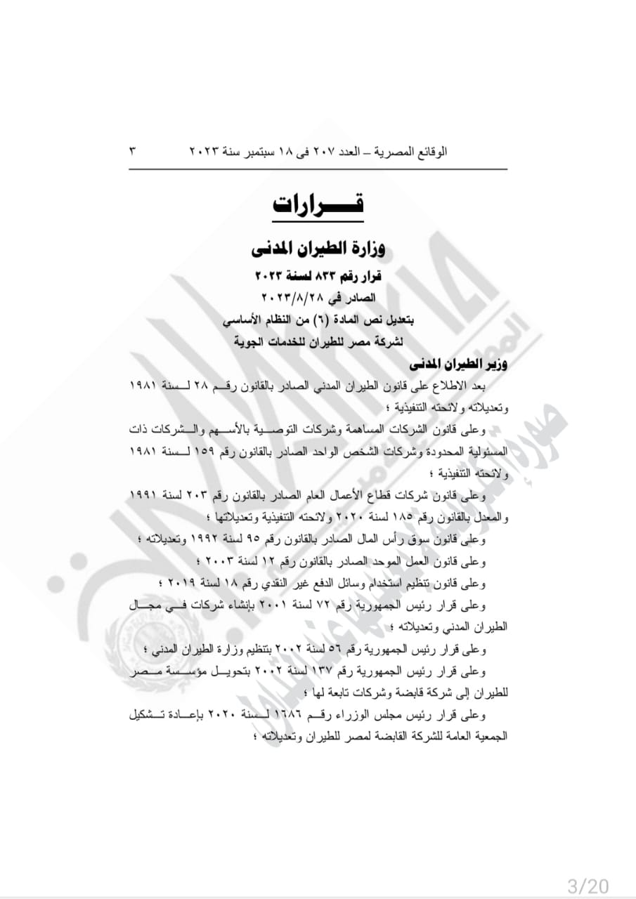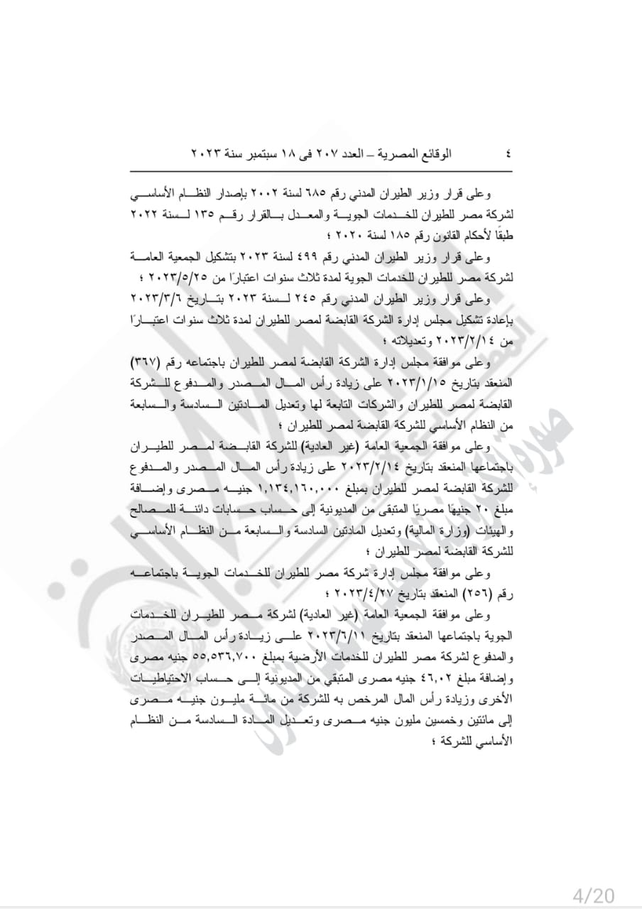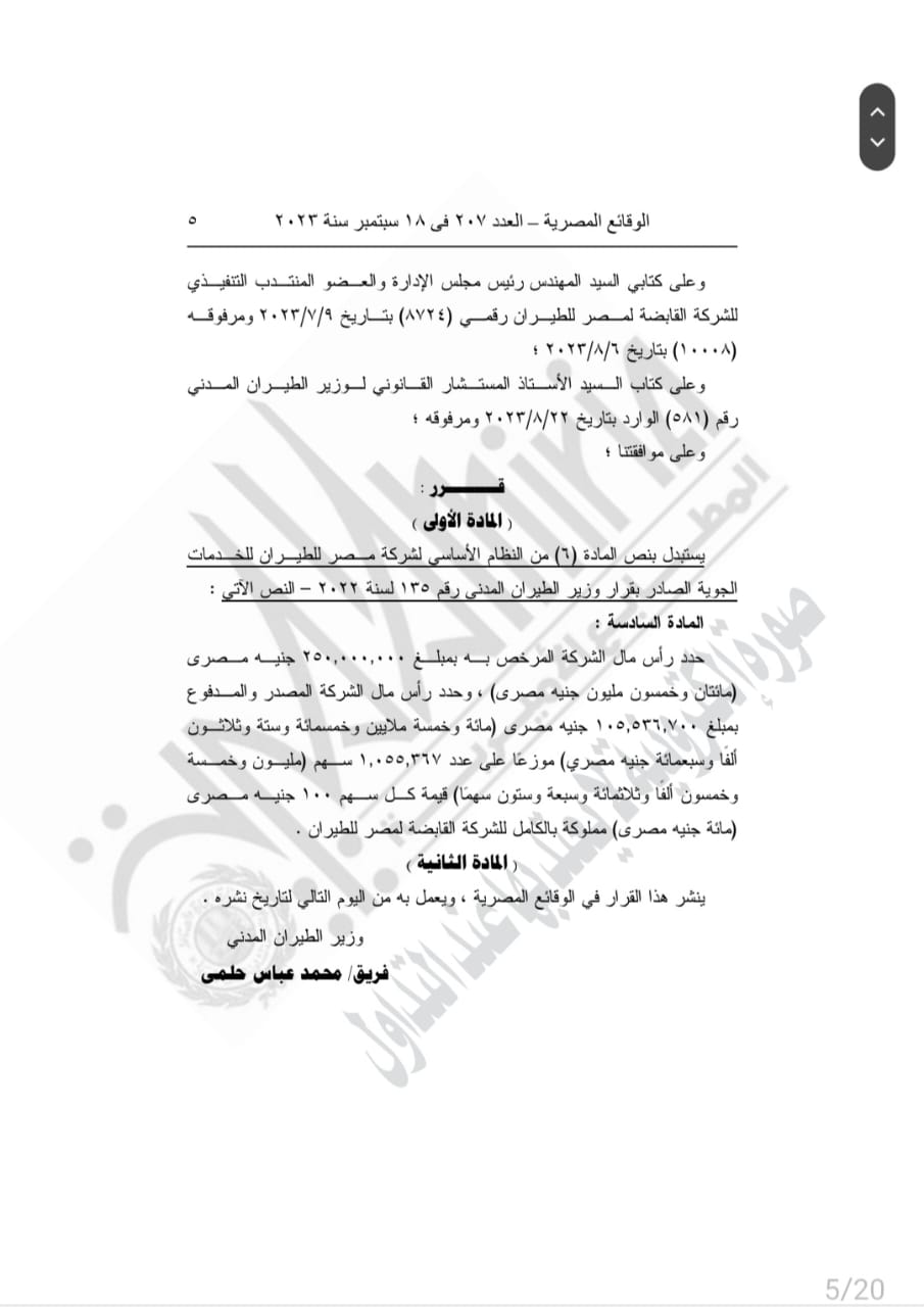 نشرت الجريدة الرسمية، اليوم الاثنين، قرار الفريق محمد عباس حلمي وزير الطيران المدني، حول استبدال نص المادة (6) من النظام الأساسي لشركة مصر للطيران للخدمات الجوية، الصادر بقرار وزير الطيران المدني رقم 135 لسنة 2022، والذي جاء نصه كالتالي: