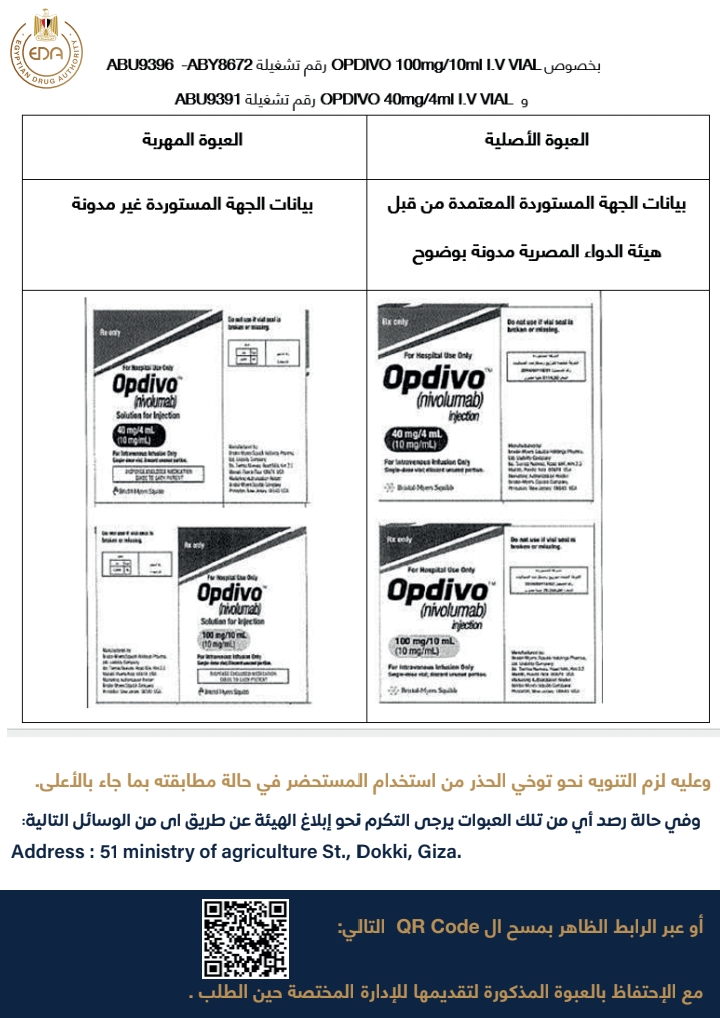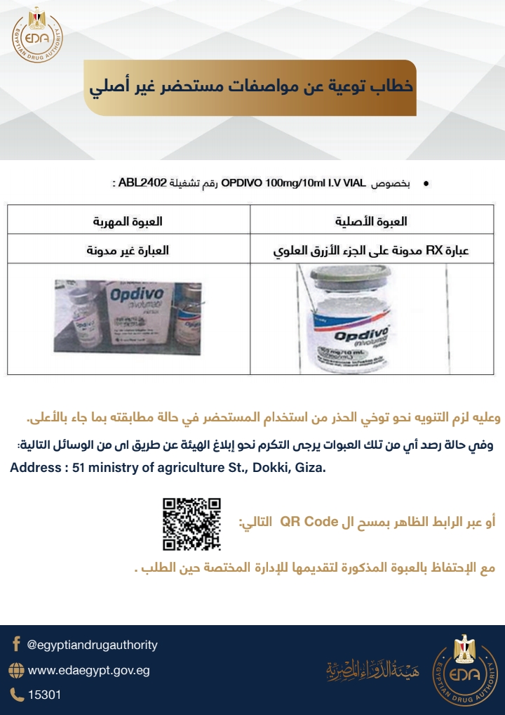 أصدرت هيئة الدواء المصرية خطاب توعية عن مواصفات مستحضر غير أصلي ومهرب في السوق، وهو مستحضر OPDIVO لعلاج السرطان.