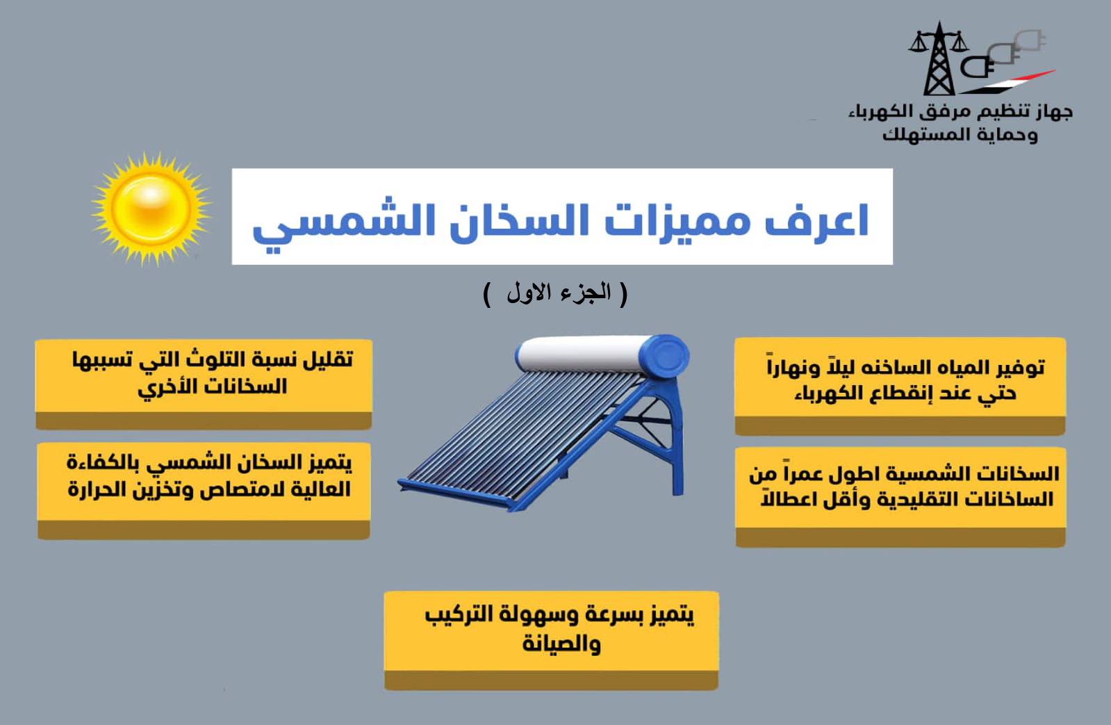وأعلن جهاز تنظيم مرفق الكهرباء وحماية المستهلك عن مميزات السخان الشمسي، وذلك ضمن جهود وزارة الكهرباء والطاقة المتجددة لزيادة الاعتماد علي الطاقة النظيفة والمتجددة.
