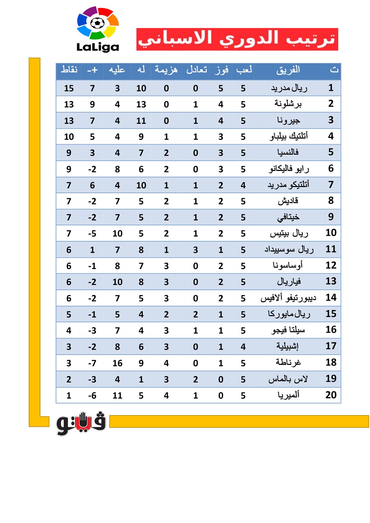 1- ريال مدريد 15 نقطة