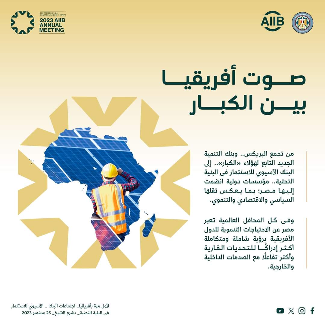 وأوضح أن مصر لا تُفوِّت أي فرصة للتواجد القوي والمؤثر فى المؤسسات الدولية للاستفادة من قدراتها وخبراتها فى دعم الخطط التنموية والاقتصادية، وقد انضمت إلى البنك الآسيوي للاستثمار في البنية التحتية بحصة تمويلية ٦٥٠ مليون دولار لتصبح أكبر مساهم فى أفريقيا ويتم التعامل معها كدولة مؤسسة إقليمية من حيث الإنشاء والتمويل، وغير إقليمية من حيث الموقع الجغرافي، كما أن لها مقعد فى مجلس الإدارة بالتناوب مع كندا.