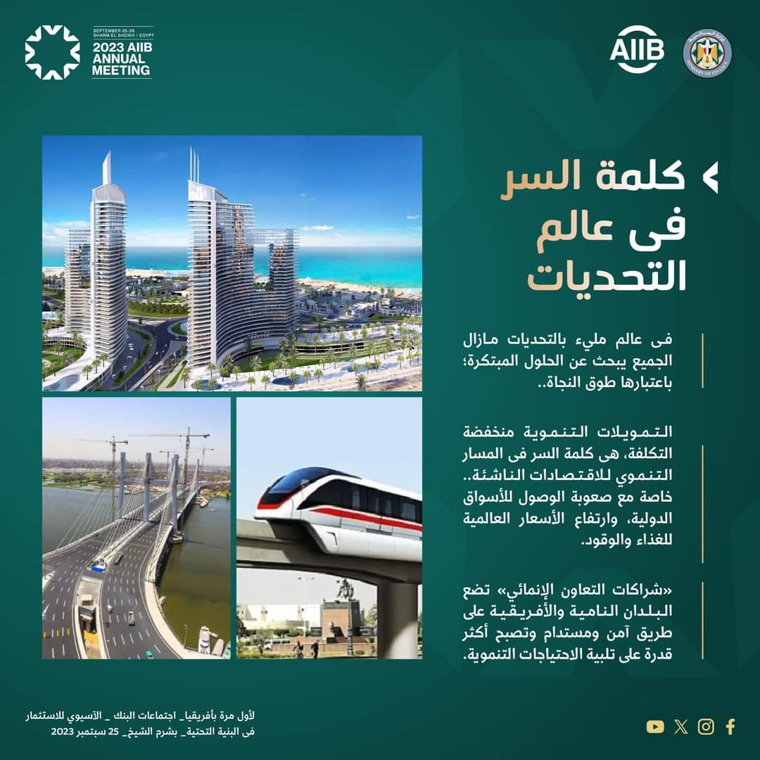 وأشاد البنك الآسيوي للاستثمار في البنية التحتية بموقع مصر الجغرافي الاستراتيجي والذي يمكننا من تحقيق الترابط القاري بين أفريقيا وآسيا وأوروبا، ومن المتوقع إنشاء شراكات تنموية عابرة للحدود يتصدرها القطاع الخاص بمشروعات واعدة.