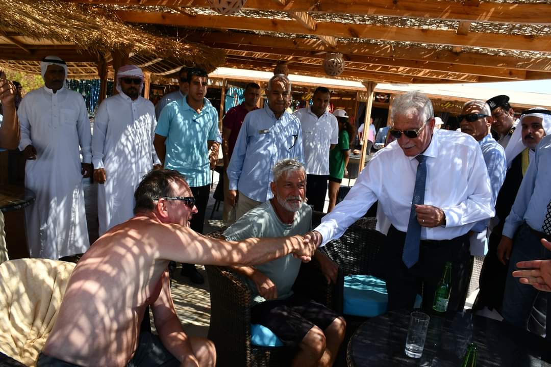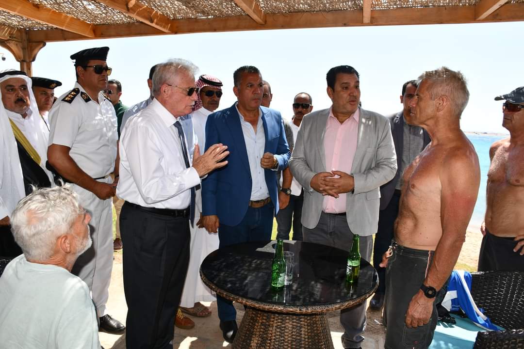 وحرص المحافظ خلال الجولة علي لقاء السياح من جنسيات مختلفة لاستطلاع آرائهم والاستماع الى وجهات نظرهم وإرسال رسالة حب وسلام ودعوة لتكرار الزيارات للتمتع بمدينة دهب الساحرة.