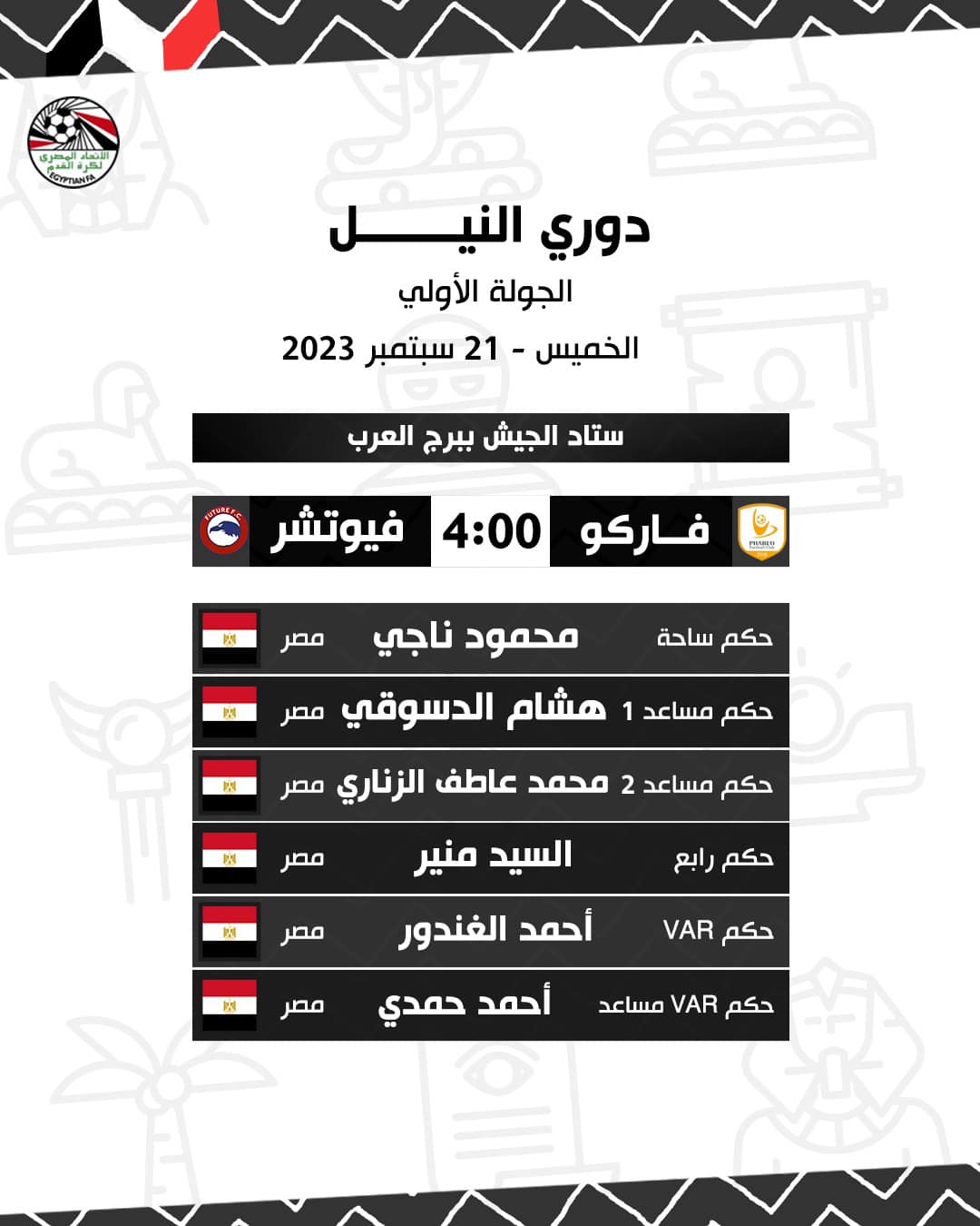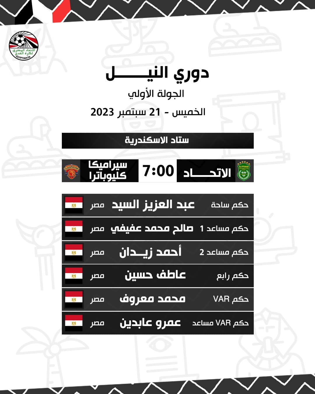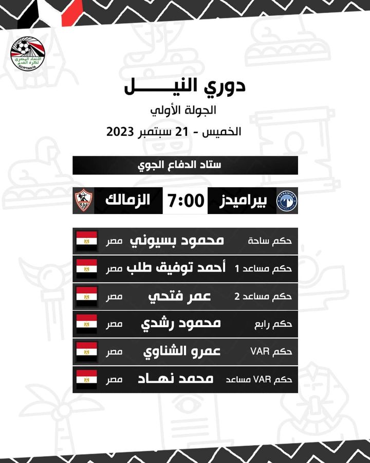 الدوري المصري، أعلنت لجنة الحكام باتحاد الكرة المصري حكام مباريات غدا الخميس، التي تقام ضمن مواجهات الجولة الأولى من الدوري المصري الممتاز وجاءت على النحو الآتي: