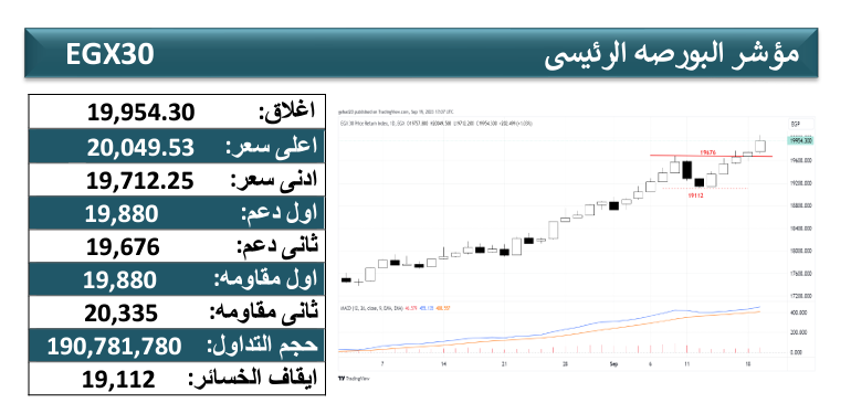 المؤشر الرئيسي EGX 30 يتحرك عند وتيرة إيجابية بمستوى يقارب الـ 20500 نقطة، ومن المتوقع أن يستمر في الثبات أعلى مستوى الدعم الرئيسي 19880 نقطة بزيادة عمليات الشراء قد يدفعه إلى الاستمرار في حصد المكاسب وتحقيق مستويات تاريخية جديدة والوصول السهل إلى المستوى 20000 نقطة خلال تعاملات الربع الثالث من العام الجاري، مدعومًا باستمرار نشاط الأسهم القيادية واستمرار اتجاه المؤسسات المالية نحو الشراء.
