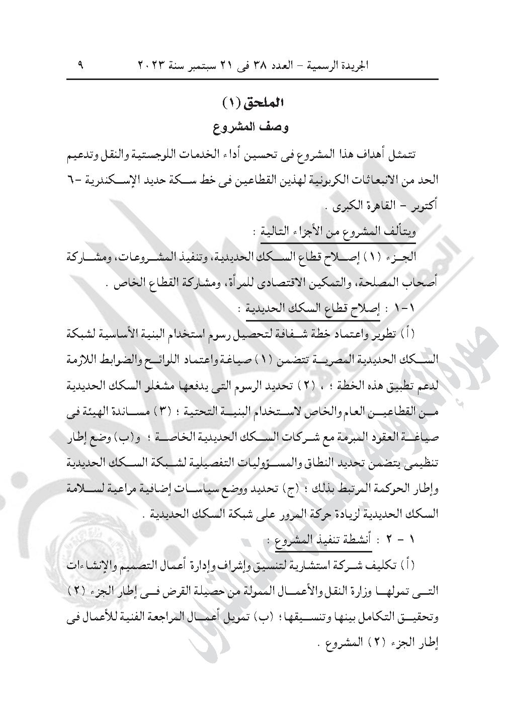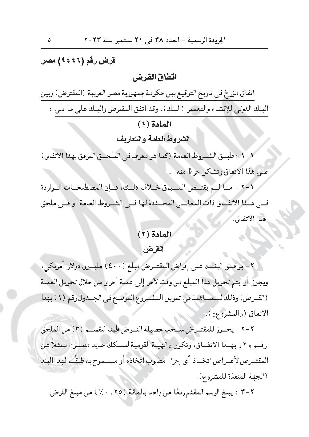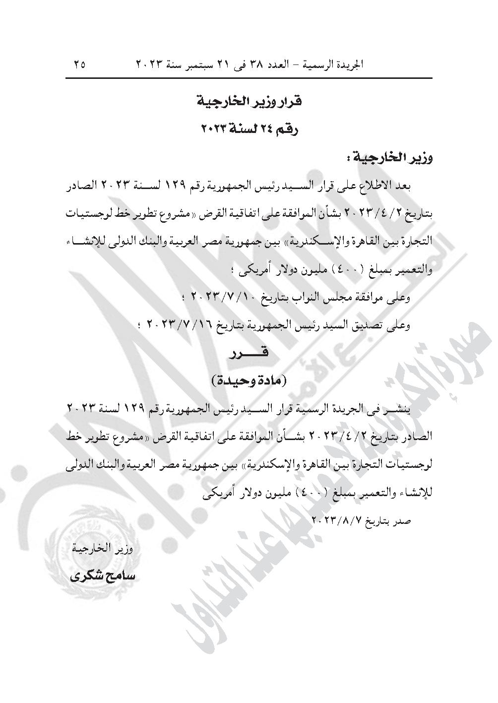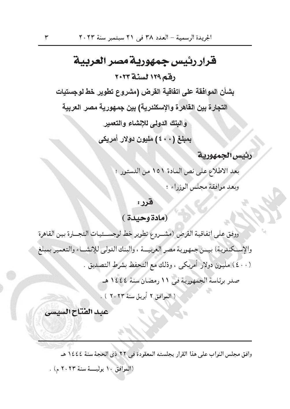نشرت الجريدة الرسمية في عددها رقم 38، الصادر في 21 سبتمبر 2023، قرارا جمهوريا جديدا للرئيس عبد الفتاح السيسي رقم 129 لسنة 2023، بشأن الموافقة على اتفاقية القرض (مشروع تطوير خط لوجستيات التجارة بين القاهرة والإسكندرية) بين جمهورية مصر العربية والبنك الدولي للإنشاء والتعمير بمبلغ (400) مليون دولار أمريكي.