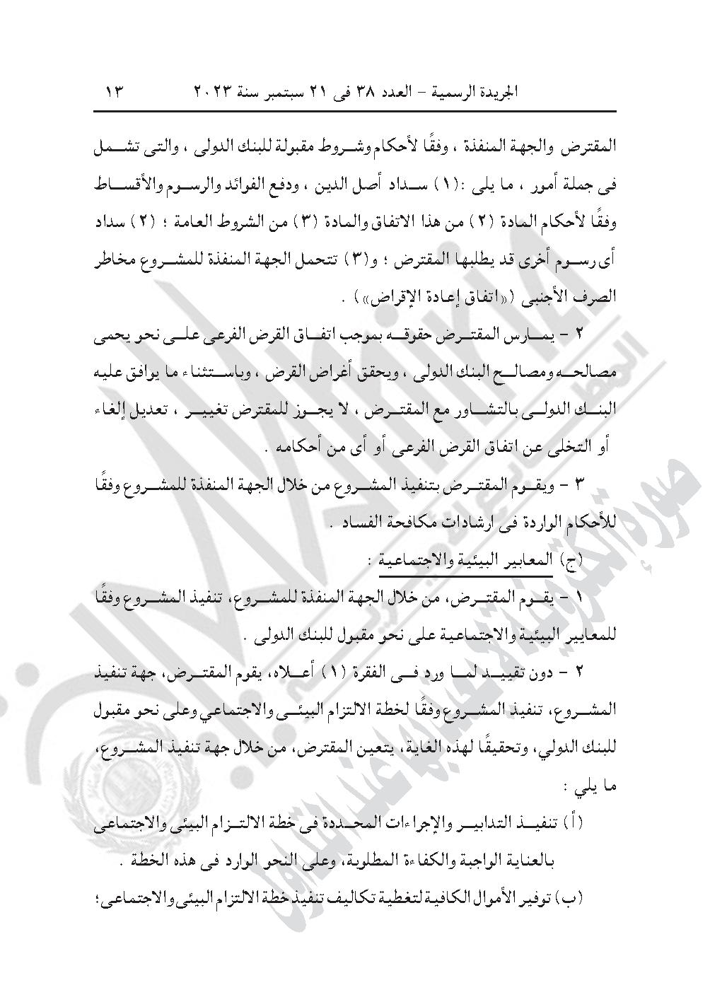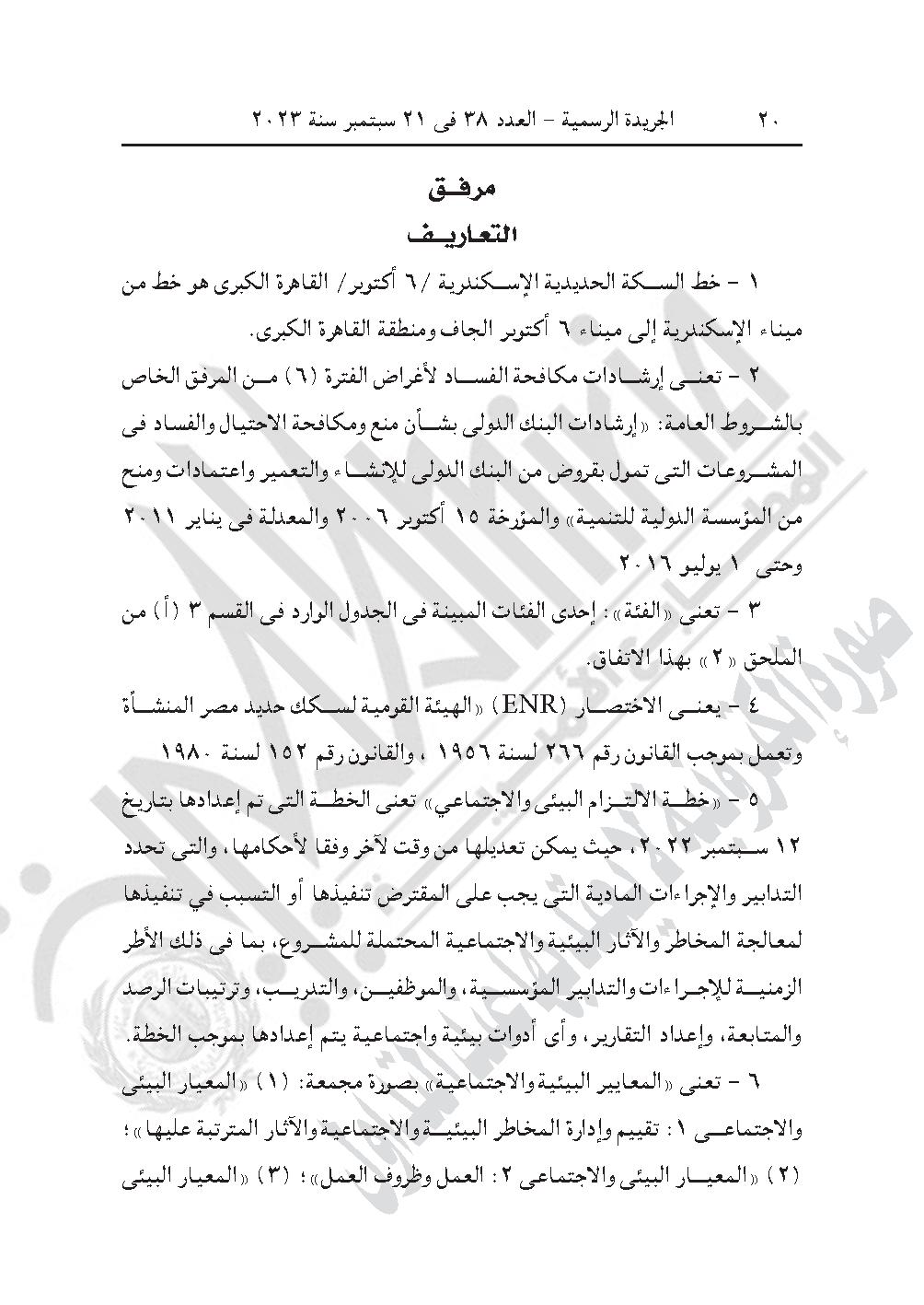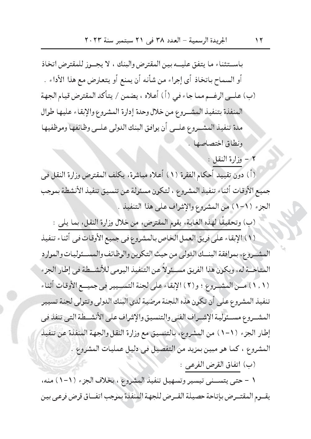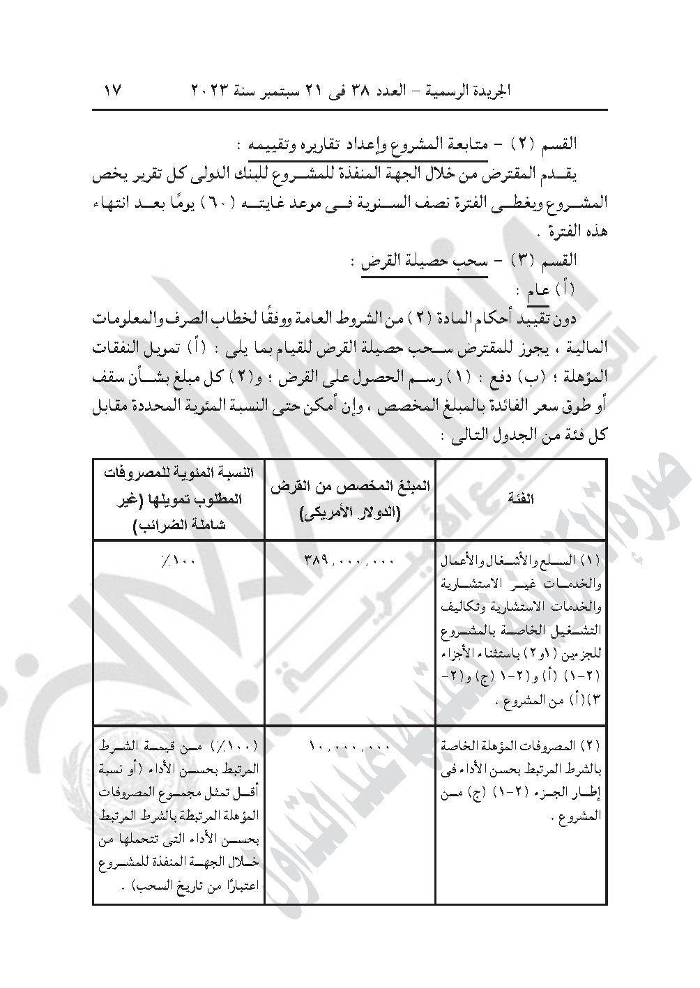 نشرت الجريدة الرسمية في عددها رقم 38، الصادر في 21 سبتمبر 2023، قرارا جمهوريا جديدا للرئيس عبد الفتاح السيسي رقم 129 لسنة 2023، بشأن الموافقة على اتفاقية القرض (مشروع تطوير خط لوجستيات التجارة بين القاهرة والإسكندرية) بين جمهورية مصر العربية والبنك الدولي للإنشاء والتعمير بمبلغ (400) مليون دولار أمريكي.