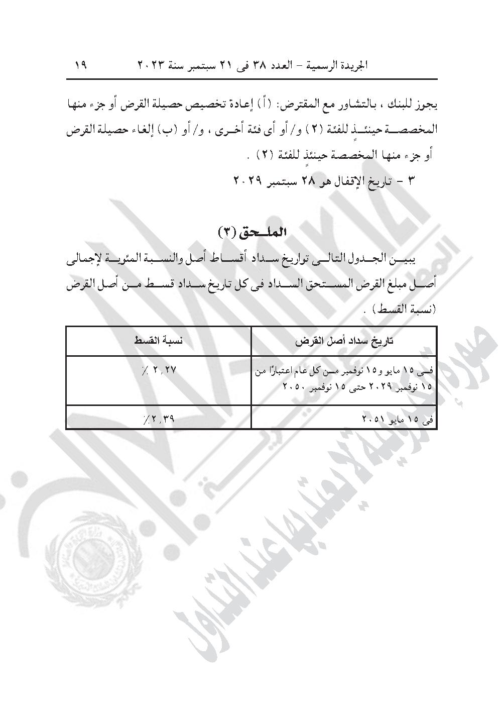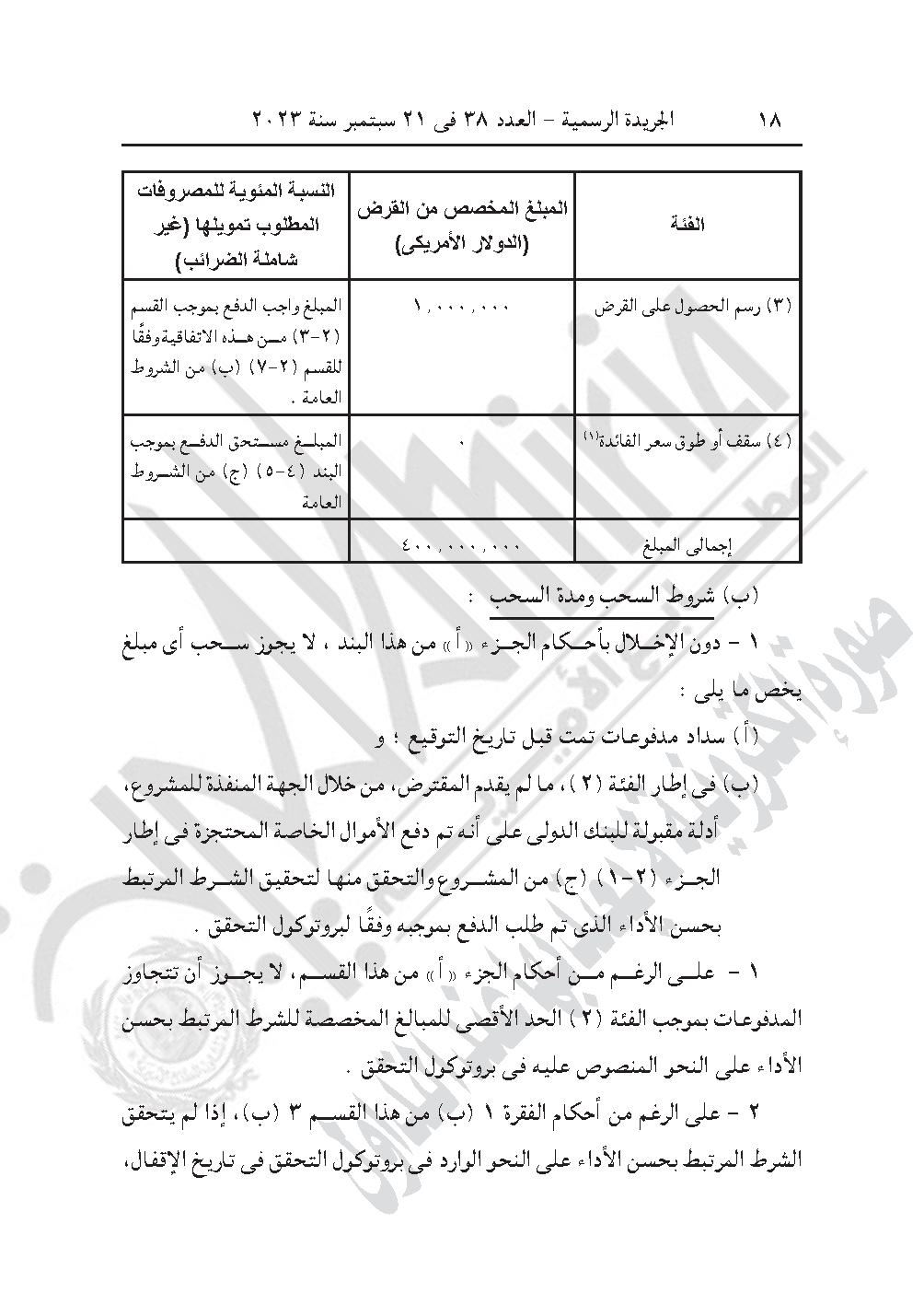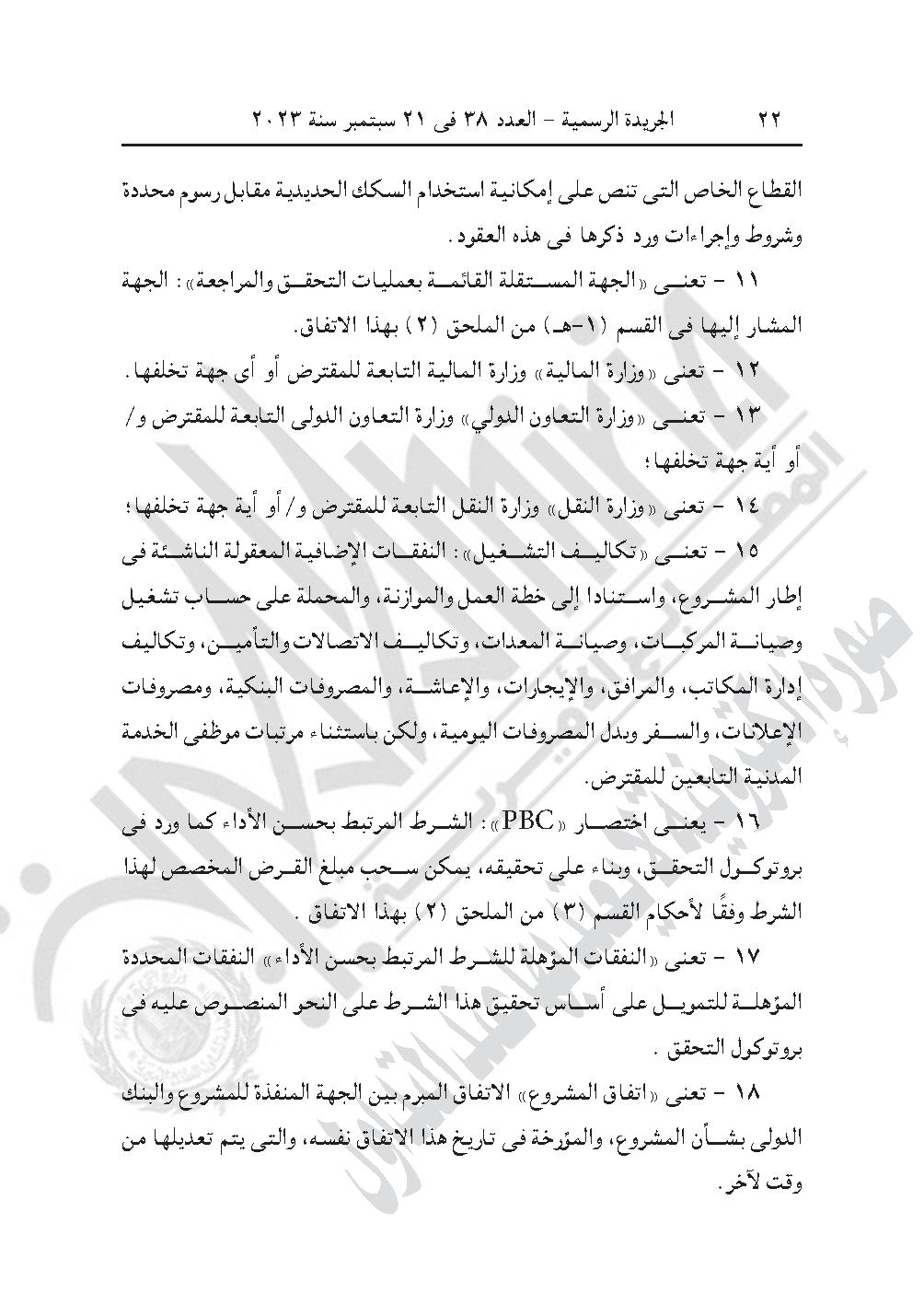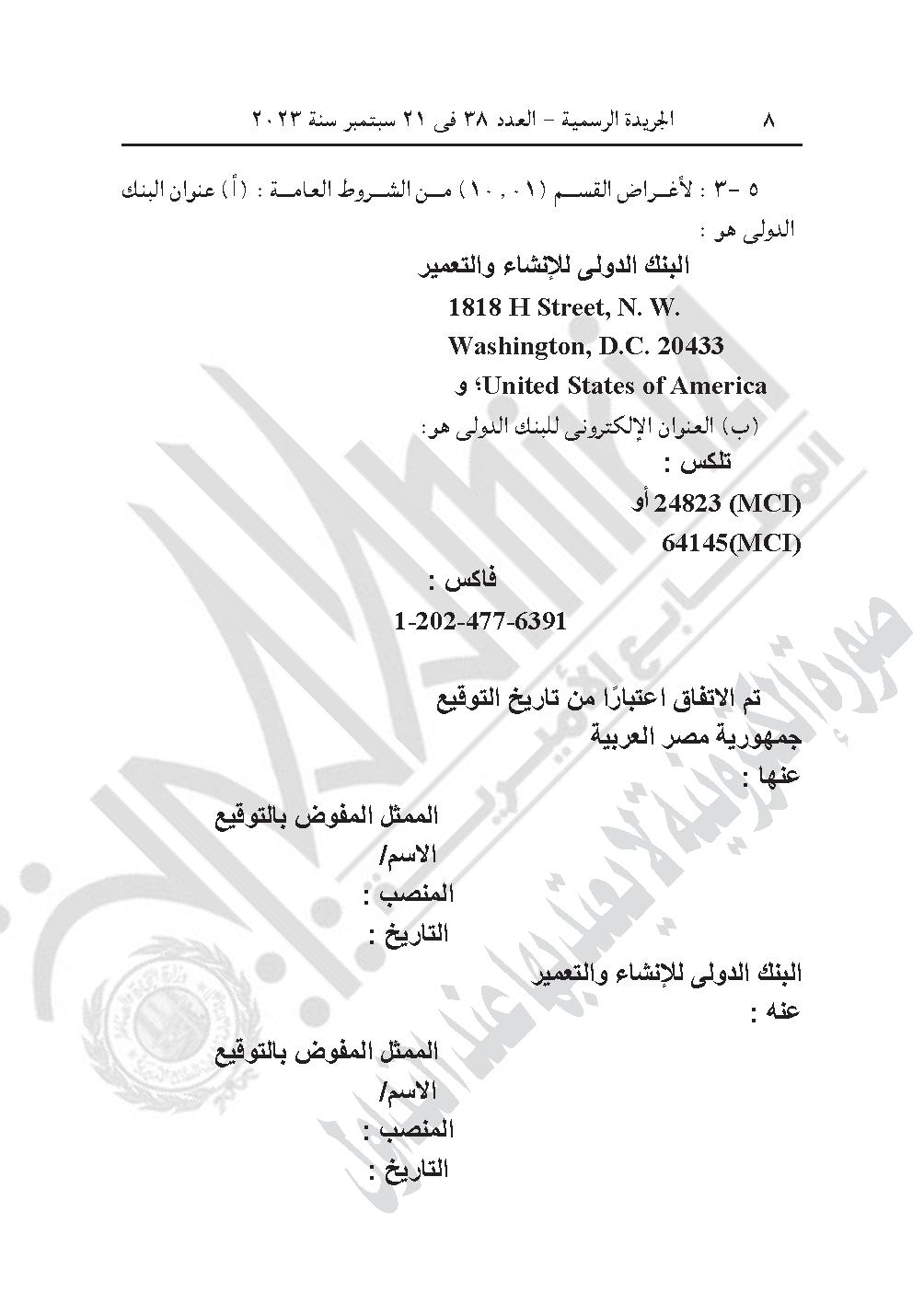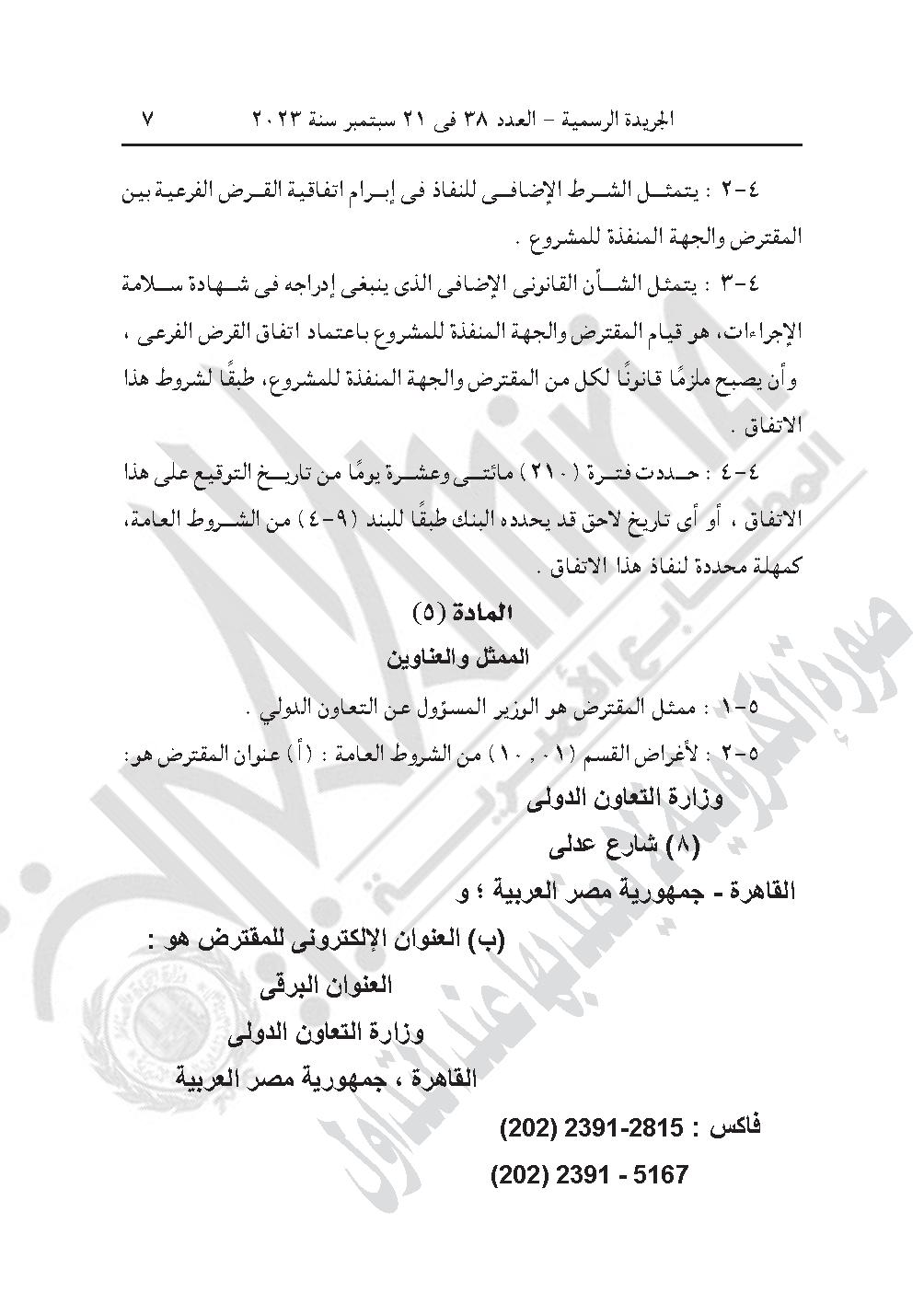 نشرت الجريدة الرسمية في عددها رقم 38، الصادر في 21 سبتمبر 2023، قرارا جمهوريا جديدا للرئيس عبد الفتاح السيسي رقم 129 لسنة 2023، بشأن الموافقة على اتفاقية القرض (مشروع تطوير خط لوجستيات التجارة بين القاهرة والإسكندرية) بين جمهورية مصر العربية والبنك الدولي للإنشاء والتعمير بمبلغ (400) مليون دولار أمريكي.