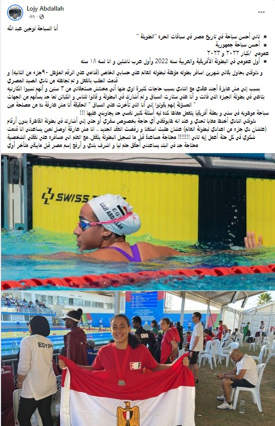 وكتبت السباحة أحد أبطال مصر عن مأساتها، عبر صفحتها بالفيس بوك، قائلة: "أنا السباحة لوجين عبد الله.. تاني أحسن سباحة في تاريخ مصر في سباقات الحرة "الطويلة ".. أحسن سباحة جمهورية عمومي /كبار ٢٠٢٢ و٢٠٢٣.. أول عمومي في البطولة الأفريقية والعربية سنة 2022 وأول عرب ناشئين وانا لسه ١٨ سنة".