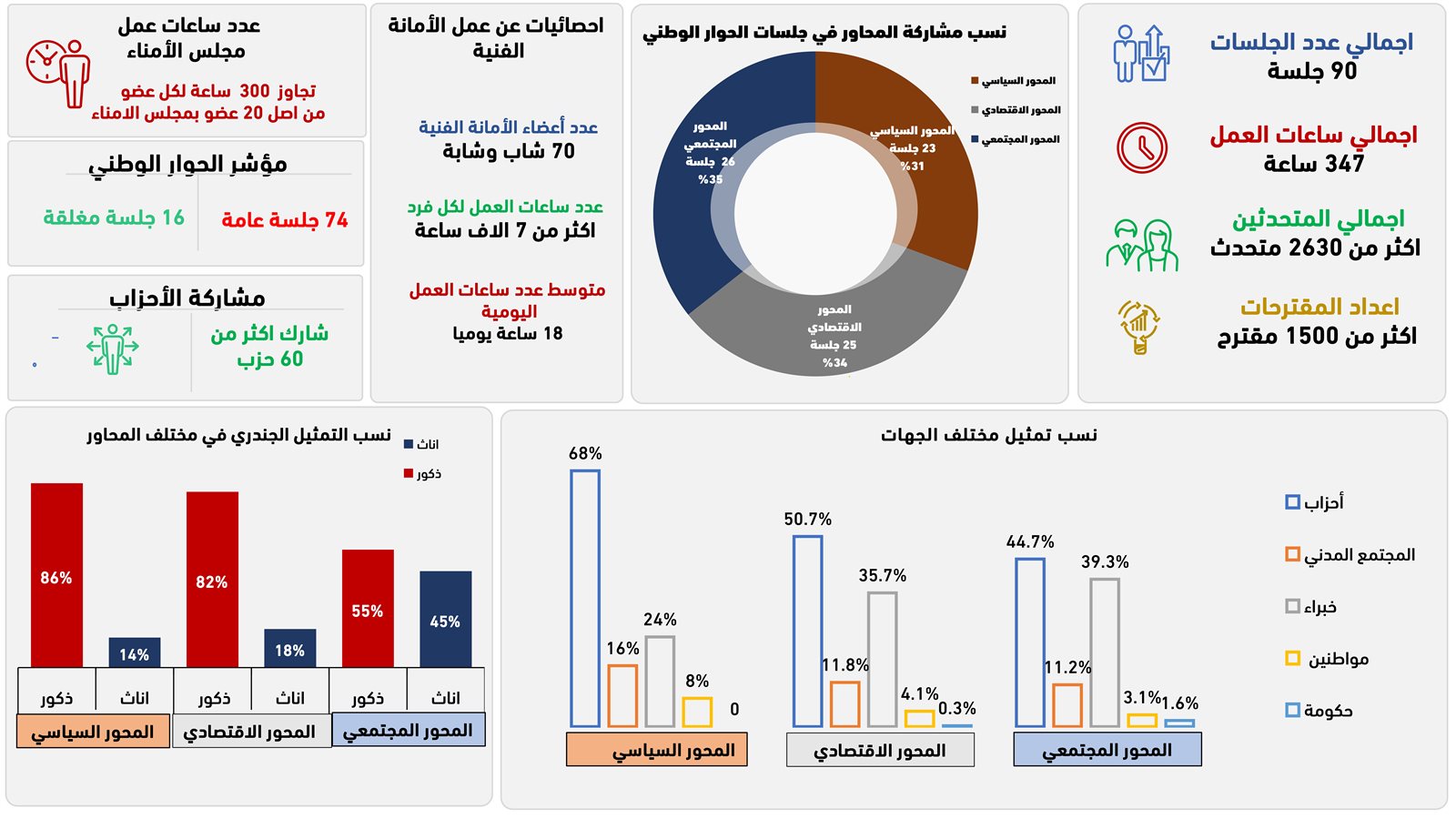 ويرفق مجلس الأمناء بهذا البيان بعض المؤشرات الإحصائية الاجمالية عما دار بالحوار في مرحلته التي تم إنجازها، فضلا عن إعادة نشر مخرجات هذه المرحلة والتي تم رفعها في حينه للسيد رئيس الجمهورية، وذلك احتراما لحق الرأي العام في المعرفة والمتابعة إعمالا لمبادئ الشفافية والعلانية، لأن هذا الحوار ملك للمجتمع المصري كله، شعبا وحكما، وليس لأطرافه أو القائمين عليه.