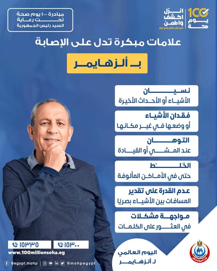 اليوم العالمي لمرض الزهايمر، تحيي منظمة الصحة العالمية اليوم في ٢١ سبتمبر اليوم العالمي لمرض الزهايمر للتوعية بأهم أعراض المرض وطرق علاجه.