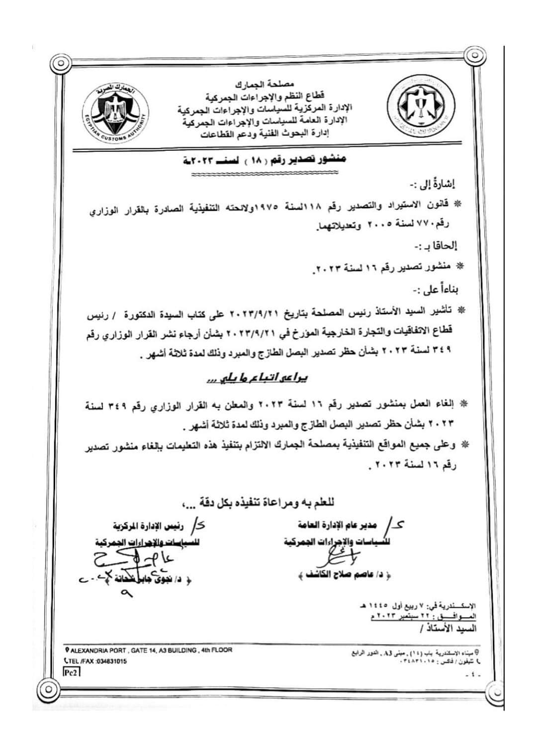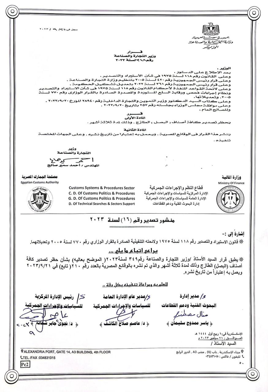 وأعلن قطاع الاتفاقيات والتجارة الخارجية بوزارة التجارة والصناعة إرجاء نشر القرار الوزاري رقم ٣٤٩ بشأن حظر تصدير البصل للخارج، وذلك لمدة ثلاثة أشهر.