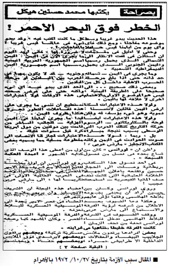 استمرت علاقة هيكل بالسادات بعد رحيل عبدالناصر، إلى نوفمبر 1972، وحدث بينهما لقاء عاصف فى قصر السادات على كورنيش الجيزة بمنطقة الدقى، وتحديدا فى الرابع من نوفمبر 1972 بسبب ما قاله هيكل فى أحد اللقاءات، ونقل إلى الرئيس بأن السياسة الآن -يقصد نظام الرئيس السادات- تسير بلا عقل، وأنها غير مهتمة بحل أزمة الشرق.. إضافة إلى مقاله «الخطر فوق البحر الأحمر» الذي تسبب فى غضب السعودية واشتكته إلى الرئيس، لما حمله المقال من اتهامات للمملكة وقتها بالسعي للسيطرة على شبه الجزيرة العربية، وشكوك حول تسهيل تمدد إسرائيل فى البحر الأحمر وفق ما رأي هيكل حينها.