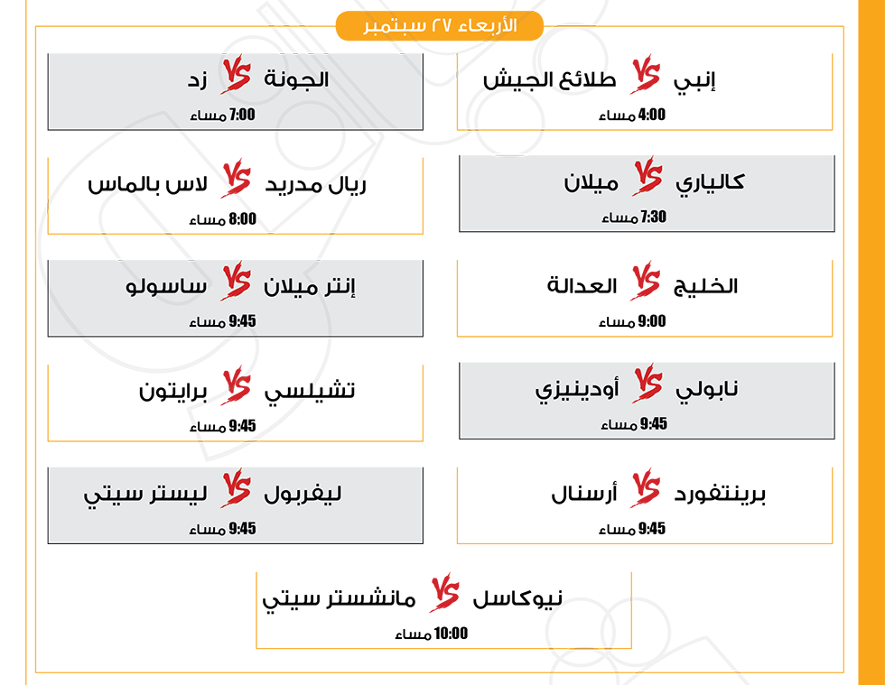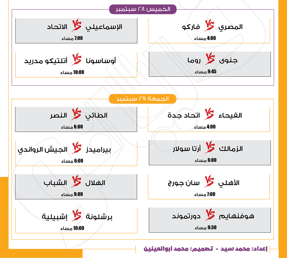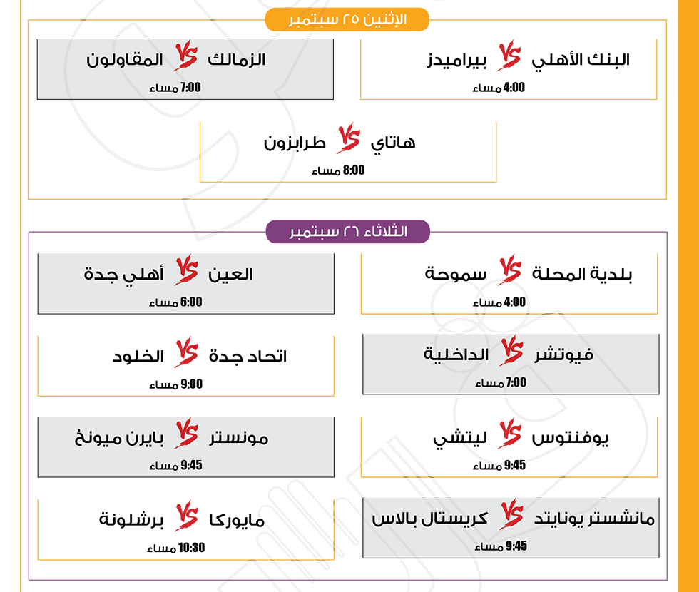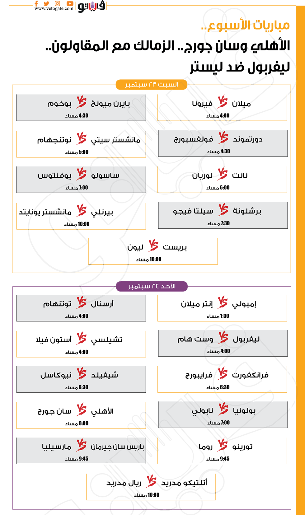 مباريات الأسبوع، الأهلي وسان جورج.. الزمالك مع المقاولون.. ليفربول ضد ليستر (إنفوجراف) السبت 23/سبتمبر/2023 - 10:04 ص 9/23/2023 10:04:04 AM الأهلي، فيتو محمد سيد شارك طباعة 18 حجم الخط شارك طباعة الزمالك بيراميدز الأهلي سان جورج ليفربول ريال مدريد