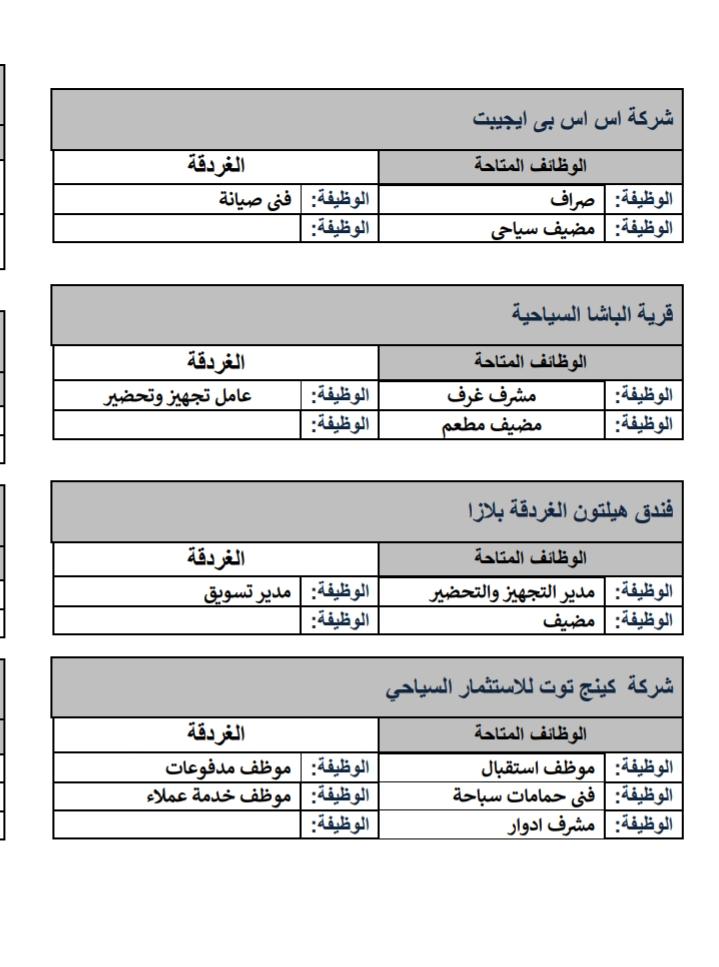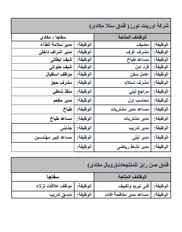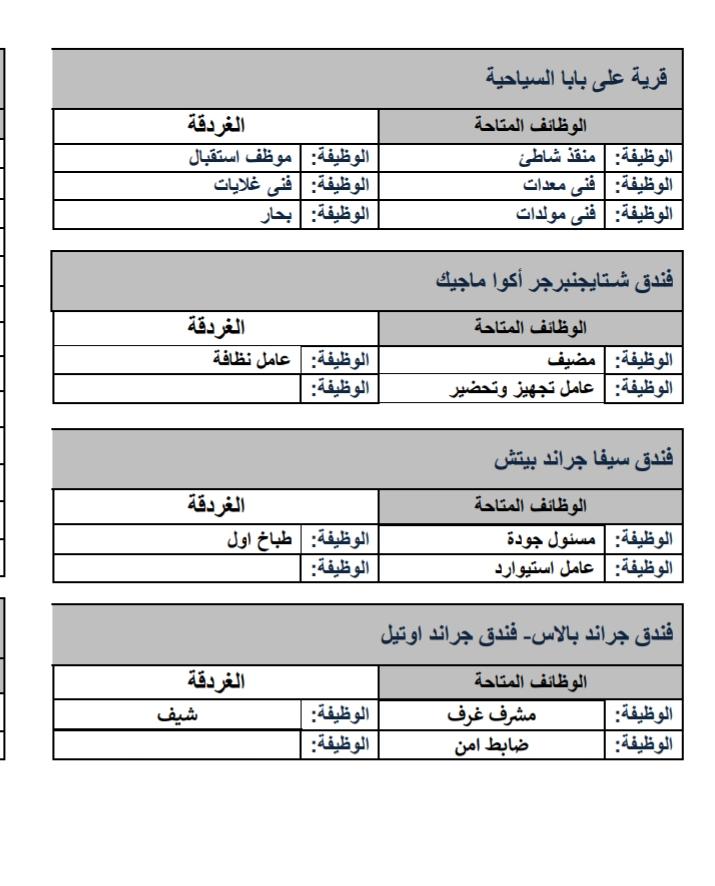 وأضاف مدير المديرية أن التخصصات المطلوبة في هذا الملتقى، على مهن فندقيةو فنية منها: حداد الوميتال، وقاطع زجاج وميكانيكي، و تبريد وتكييف، ومهندسين، وبيطري، ولغات إنجليزي وروسي وايطالي وروماني وتشيكي والماني،ومدير سلامة الغذاء، ومدير إشراف داخلى، وشيف ايطالى، وحلوانى، وموظف استقبال، ومشرف حجز، ومنقذ شاطئ، ومدير مطعم، وطباخ، ومساعد طباخ، وجناينى، ومساعد كبير مهندسين، وموظف علاقات نزلاء، ومنسق تدريب، ومضيف، ومشرف غرف،وافراد امن،وعامل سكن، ومشرف استلام، ومراجع ليلي،محاسب أول، ومساعد مدير مشتريات، ومدير مشتريات، ومدير تدريب، ومدير ليلى، ومدير نشاط رياضى،ومساعد مدير مكافحة افات، وفنى غلايات، وبحار، وموظف مدفوعات، وموظف خدمة عملاء، وعامل تجهيز وتحضير، وفني حمامات سباحة، وذلك في العديد من الفنادق والمنشآت السياحية الكبري العاملة بمدينة الغردقة،وسفاجا، ومرسي علم التابعين للمحافظة كما هو موضح بالجدول المرفق بالبيان...