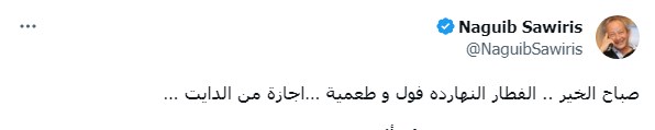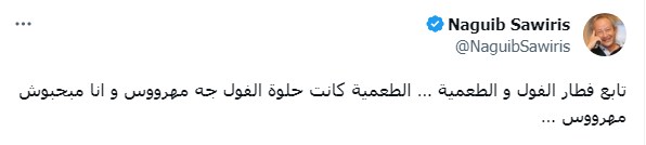 ومازح المهندس نجيب ساويرس متابعيه فقال: "تابع فطار الفول والطعمية… الطعمية كانت حلوة الفول جه مهرووس وانا مبحبوش مهرووس…".