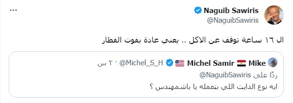 فرد عليه مهندس نجيب ساويرس قائلًا: "الـ ١٦ ساعة توقف عن الأكل.. يعني عادة بفوت الفطار"