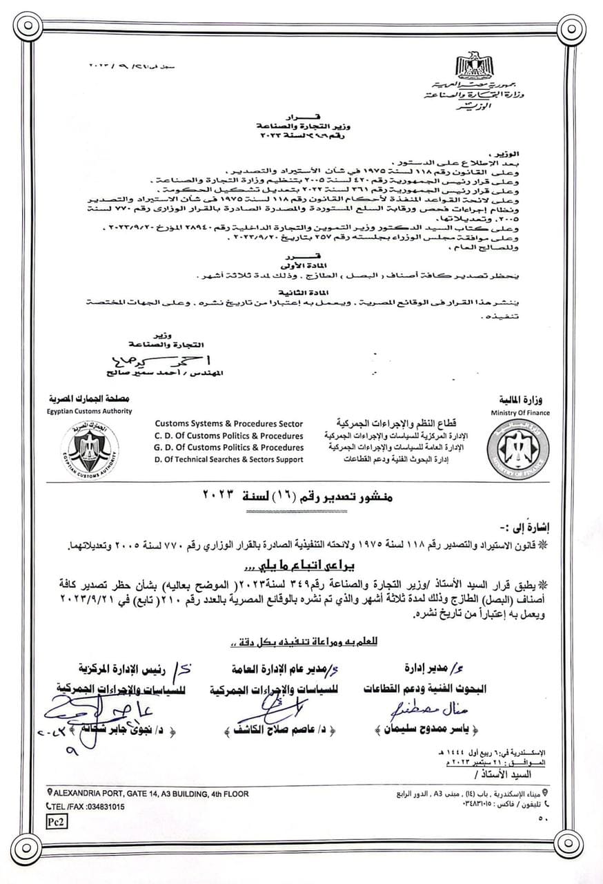 وتابع: المصدر أن منشور تصدير رقم (١٦) لسنة ٢٠٢٣ فإنه بشأن تطبيق قرار وزير التجارة والصناعة رقم ٣٤٩ لسنة ۲۰۲۳ الخاص بحظر تصدير كافة أصناف (البصل) الطازج وذلك لمدة ثلاثة أشهر والذي تم نشره بالوقائع المصرية بالعدد رقم ۲۱۰ (تابع) في ۲۰۲۳/۹/۲۱، ويعمل به إعتبارًا من تاريخ نشره.