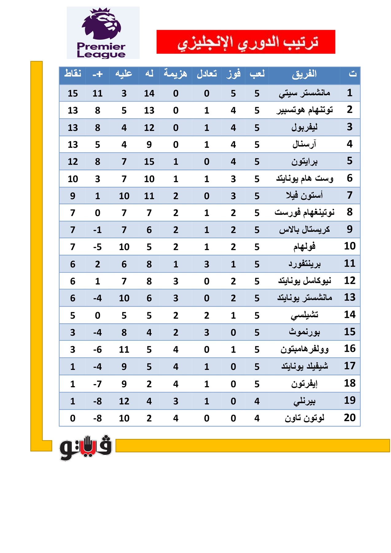 ويتصدر مانشستر سيتي جدول ترتيب الدوري الإنجليزي الممتاز بعد انتهاء الجولة الخامسة بفارق نقطتين عن توتنهام وليفربول وأرسنال.