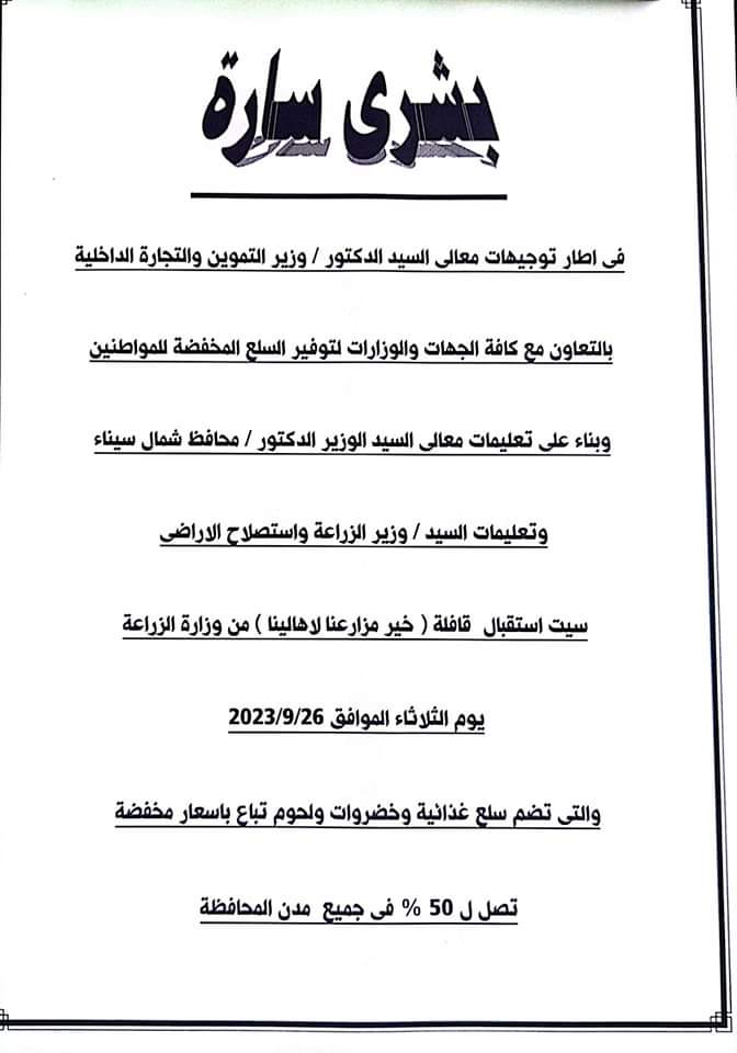 أعلنت مديرية التموين والتجارة الداخلية بمحافظة شمال سيناء عن استقبال المحافظة الثلاثاء المقبل، قافلة «خير مزارعنا لأهالينا» والتي تقدمها وزارة الزراعة واستصلاح الأراضي لتوفير السلع الأساسية للمواطنين بتخفيضات تصل إلى 50%.