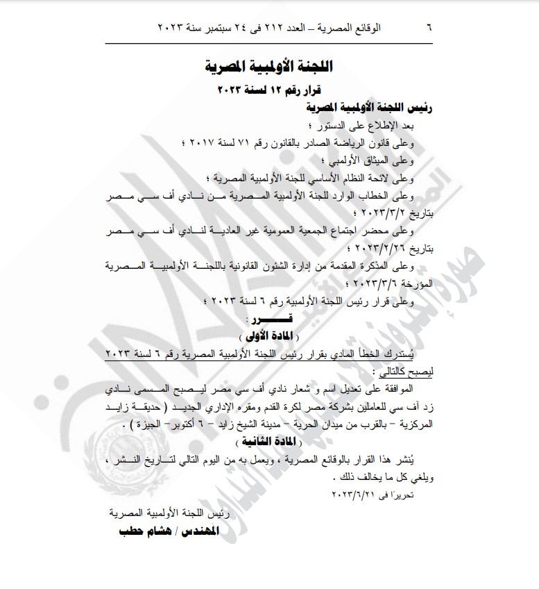 وجاء في نص المادة الأولى لقرار اللجنة الأولمبية المصرية "يستدرك الخطأ المادي بقرار رئيس اللجنة الأولمبية المصرية رقم ٦ لسنة ٢٠٢٣، ليصبح كالتالي: الموافقة على تعديل اسم وشعار نادي إف سي مصر ليصبح المـسمی نادي زد إف سي للعاملين بشركة مصر لكرة القدم ومقره الإداري الجديد (حديقة زايد المركزية - بالقرب من ميدان الحرية - مدينة الشيخ زايد - ٦ أكتوبر - الجيزة).