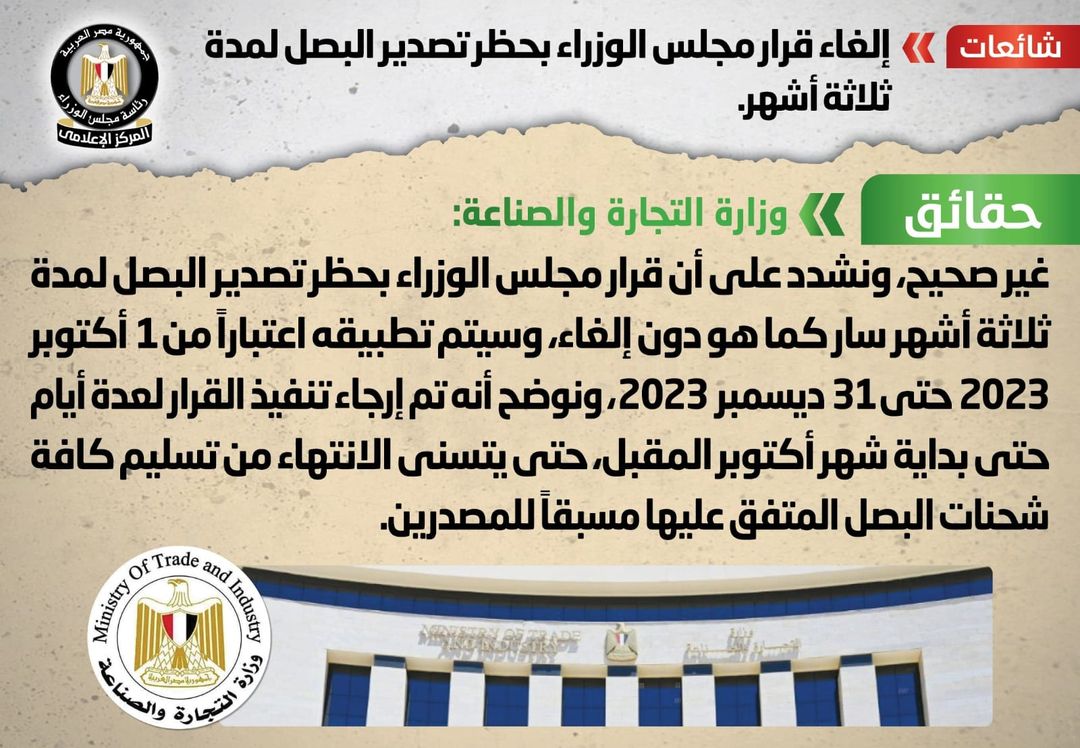 وقام المركز الإعلامي لمجلس الوزراء بالتواصل مع وزارة التجارة والصناعة، والتي نفت تلك الأنباء، مُؤكدةً أنه لا صحة إلغاء قرار مجلس الوزراء بحظر تصدير البصل لمدة ثلاثة أشهر، مُشددةً على أن قرار مجلس الوزراء بحظر تصدير البصل لمدة ثلاثة أشهر سار كما هو دون إلغاء، وسيتم تطبيقه اعتبارًا من ١ أكتوبر ٢٠٢٣ حتى ٣١ ديسمبر ٢٠٢٣، مُوضحةً أنه تم إرجاء تنفيذ القرار لعدة أيام حتى بداية شهر أكتوبر المقبل، حتى يتسنى الانتهاء من تسليم كافة شحنات البصل المتفق عليها مسبقًا للمصدرين.