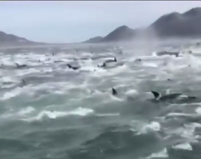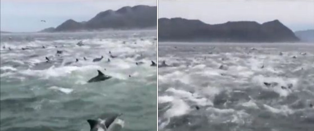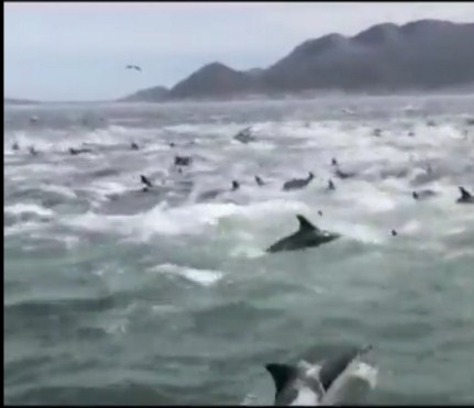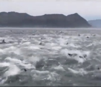 ظاهرة غريبة في جنوب أفريقيا، تداول نشطاء مواقع التواصل الاجتماعي مقطع فيديو عن ظاهرة وصفوها بـ "الغريبة" في جنوب إفريقيا، ويظهر الفيديو مئات من الدولافين وهم يتحركون بحركات "هيستيرية" قرب الشواطئ في دولة جنوب أفريقيا.