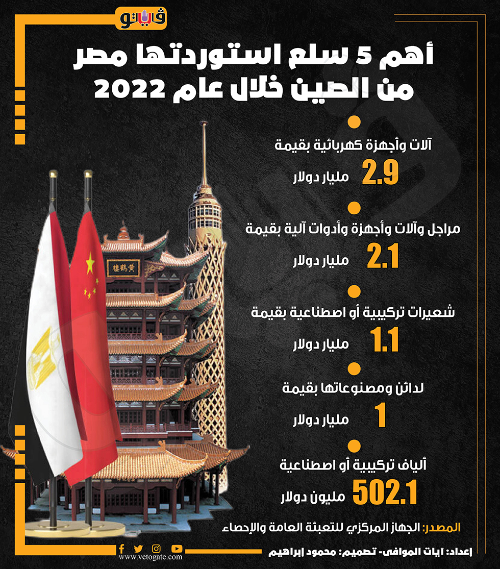 أهم 5 سلع استوردتها مصر من الصين خلال عام 2022 (إنفوجراف) الأربعاء 27/سبتمبر/2023 - 09:43 ص 9/27/2023 9:43:16 AM سلع استوردتها مصر من الصين، فيتو آيات الموافى شارك طباعة 18 حجم الخط شارك طباعة وآلات بئة العامة والاحصاء دولار