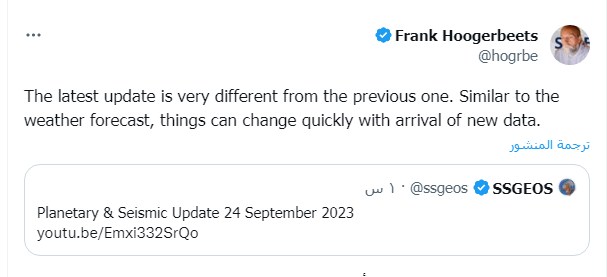 وحذر العالم الهولندي فرانك هوجربيتس من الزلزال المدمر الجديد فقال: "أعيد النظر في الكواكب التي ناقشتها في التحديث السابق في يوم 22 سبتمبر كان لدينا كوكب المريخ وعطارد والمشترى في اقتران، وبعد 3 أيام بالضبط، لدينا اقتران بين الزهرة والشمس والمريخ، هذا ليس تقاربًا، لا استطيع أن أسميه تقاربًا قريبًا لكنه قريب"