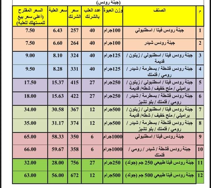 جبنة رودس شيدر 100 جرام إلى سعر 7.5 جنيه للعبوة للمستهلك، وسعر 264 جنيها للشرنك عدد 40 علبة، فيما سجلت العبوة سعر 6.60 جنيه للجملة.