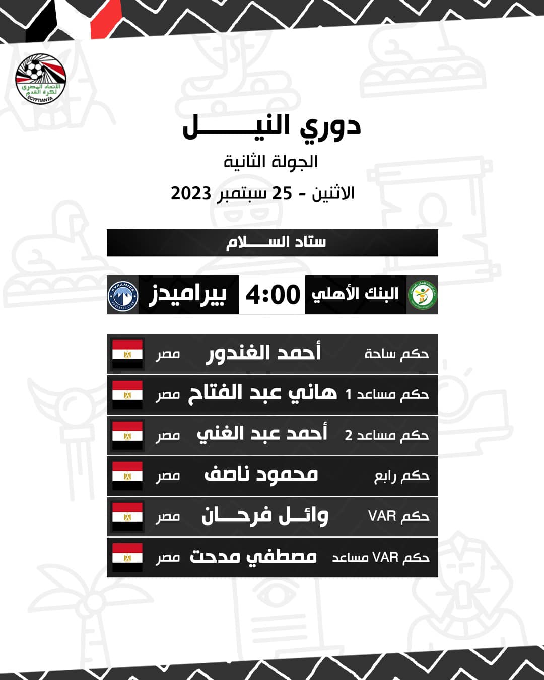 ويدير مباراة الزمالك أمين عمر بينما يدير مباراة بيراميدز والبنك الأهلي أحمد الغندور.