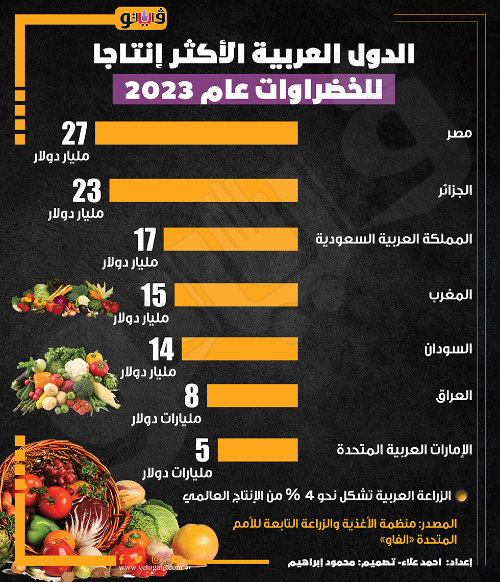 الدول العربية الأكثر إنتاجا للخضراوات عام 2023 (إنفوجراف) الأربعاء 27/سبتمبر/2023 - 11:13 ص 9/27/2023 11:13:03 AM الخضراوات، فيتو احمد علاء شارك طباعة 18 حجم الخط شارك طباعة قائمة الدول العربية الأكثر إنتاجا للخضراوات عام 2023 الجزائر السعودية المغرب السودان العراق الإمارات العربية المتحدة منظمة الأغذية والزراعة التابعة للأمم المتحدة الفاو