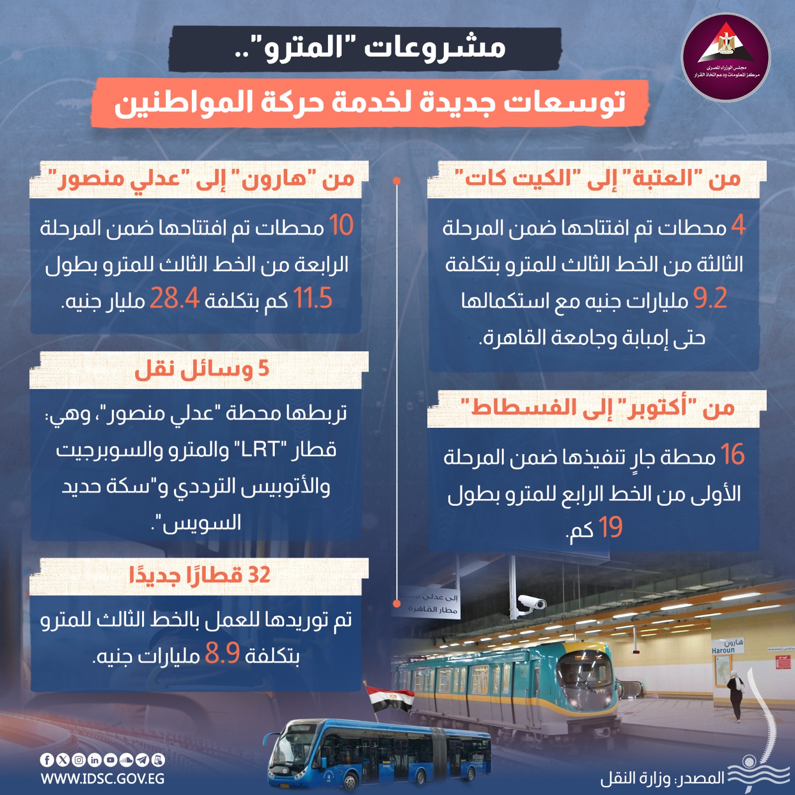 نشرت الصفحة الرسمية لمركز المعلومات ودعم اتخاذ القرار بمجلس الوزراء إنفوجرافًا جديدًا تحت عنوان « مشروعات المترو، توسعات جديدة لخدمة حركة المواطنين».