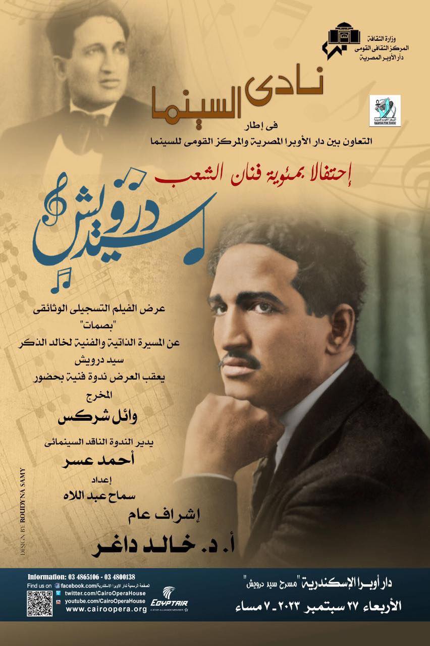 تواصل دار الاوبرا المصرية برئاسة الدكتور خالد داغر احتفالاتها بمئوية الموسيقار سيد درويش حيث يعرض نادى سينما اوبرا الاسكندرية بالتعاون مع المركز القومي للسينما الفيلم الوثائقى "بصمات" وذلك فى السابعة مساء الاربعاء 27 سبتمبر على مسرح اوبرا سيد درويش " اوبرا الاسكندرية ".