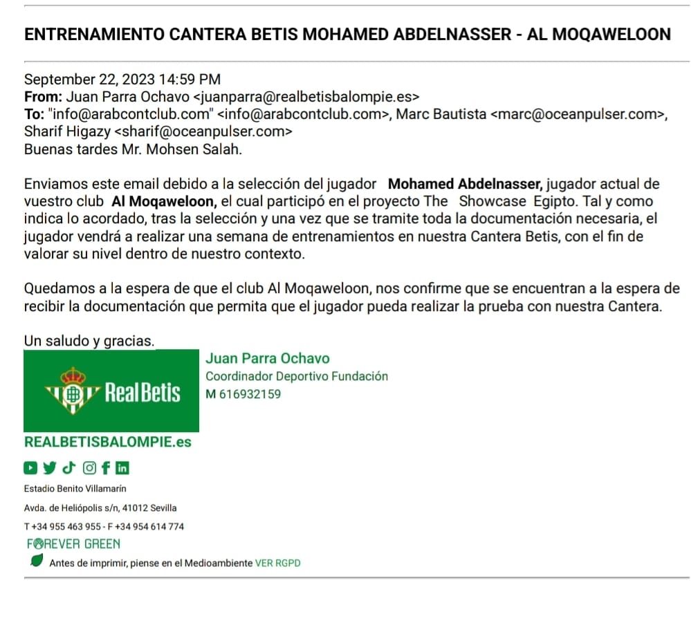 وعلي صعيد آخر جه نادي ريال بيتيس الإسباني، الدعوة للاعب نادي المقاولون العرب، محمد عبدالناصر، مواليد 2006، لقضاء فترة معايشة بالنادي الإسباني خلال الفترة المقبلة تمهيدا لضم اللاعب.