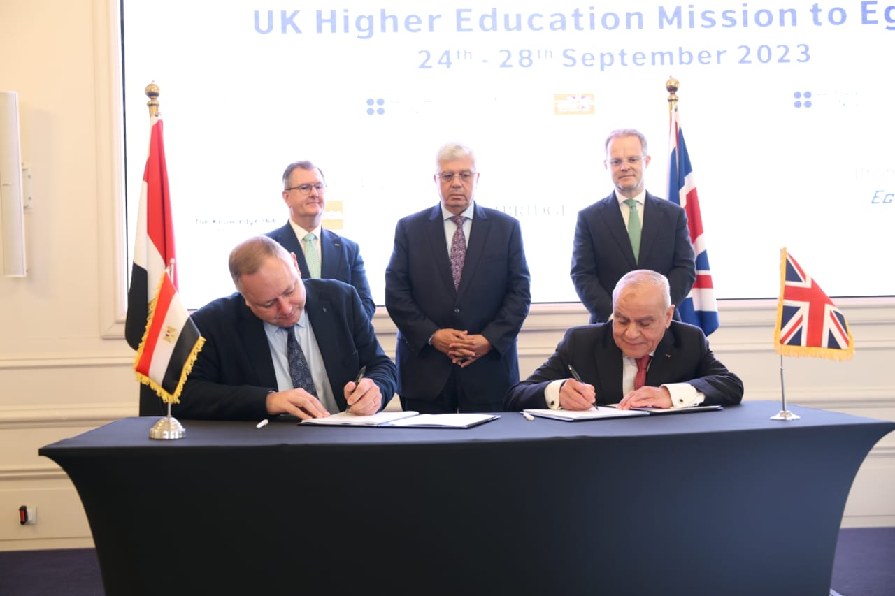 شهد الدكتور أيمن عاشور وزير التعليم العالي والبحث العلمي، جيفري دونالد المبعوث التجاري البريطاني، والسفير البريطاني في مصر جاريث بايلي، صباح اليوم الإثنين، توقيع مذكرات تفاهم بين عدد من الجامعات والمؤسسات المصرية والبريطانية، بحضور مارك هوارد مدير المركز الثقافي البريطاني في مصر، وإيان غراي رئيس الغرفة التجارية المصرية البريطانية بلندن، والدكتورة رشا كمال الملحق الثقافي ومدير البعثة التعليمية بلندن، ولفيف من رؤساء الجامعات المصرية وقيادات الوزارة وممثلي 10 جامعات و5 شركات ومؤسسات بريطانية.